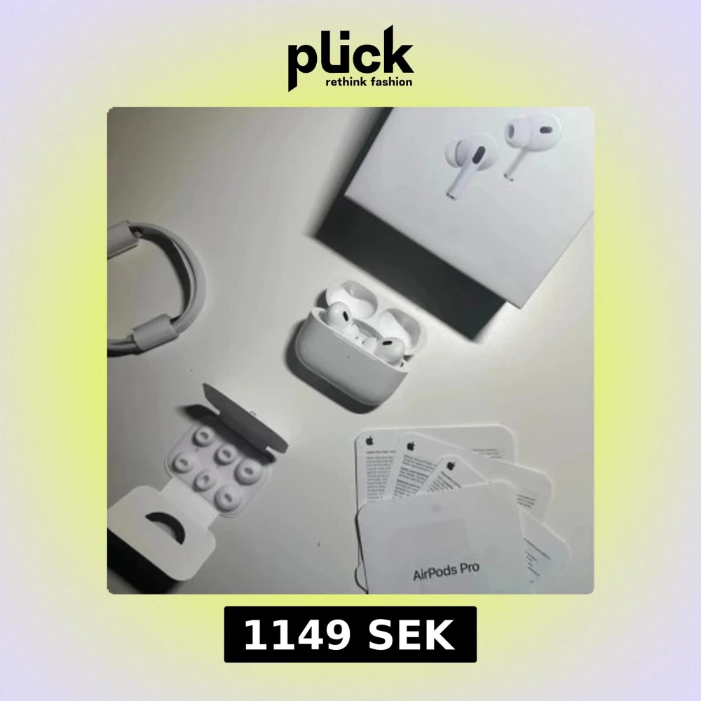 Apple AirPods Pro trådlösa hörlurar med laddningsetui, extra öronkuddar och originalförpackning. Komplett med laddningskabel och manualer. Produkten ser ut att vara i mycket gott skick utan synligt slitage eller defekter. Perfekt för brusreducering och hög ljudkvalitet.