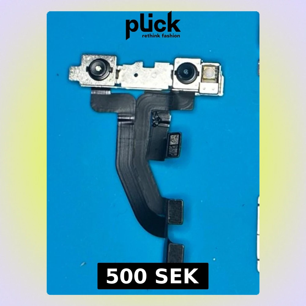 Säljer en Face ID och frontkamera modul till iPhone X/Xs/Xs plus. Modulen har svart flexkabel och metallfäste, med flera sensorer och kameror integrerade. Perfekt för dig som behöver byta ut Face ID eller frontkamera på din iPhone.