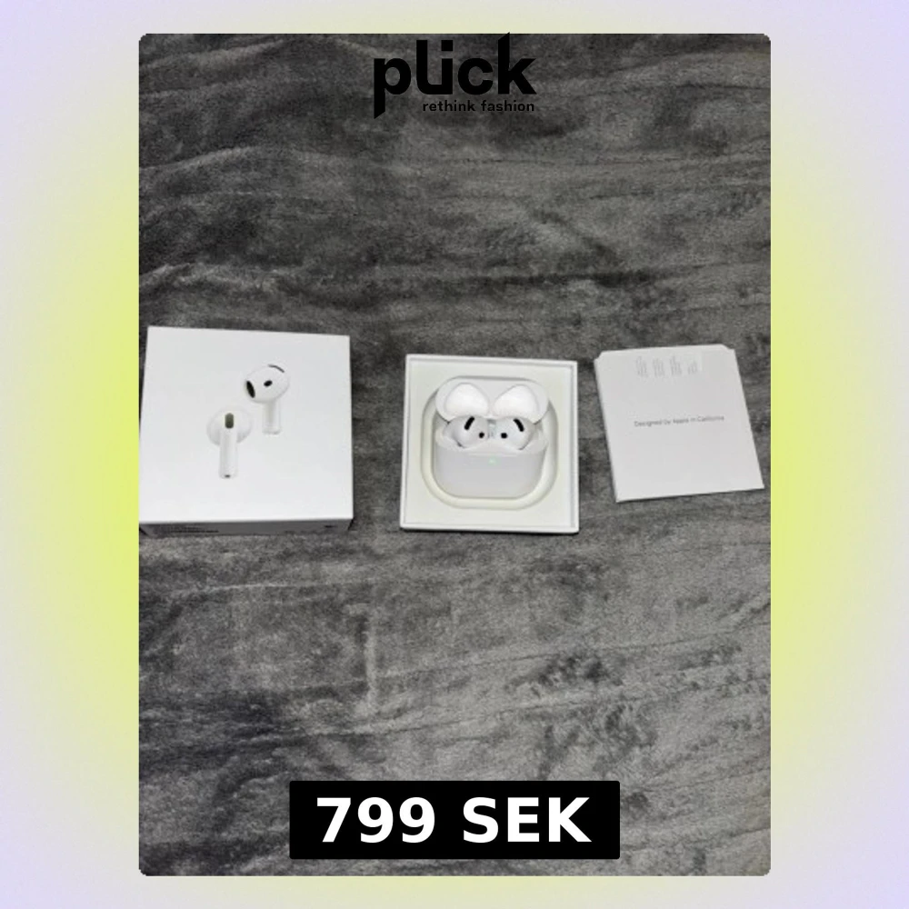 Säljer ett par Apple AirPods 4 i originalförpackning med laddningsetui och manual. Hörlurarna och etuiet ser ut att vara i mycket gott skick utan synligt slitage. Perfekt för trådlös musik och samtal med hög ljudkvalitet. Snabb och enkel anslutning till Apple-enheter.