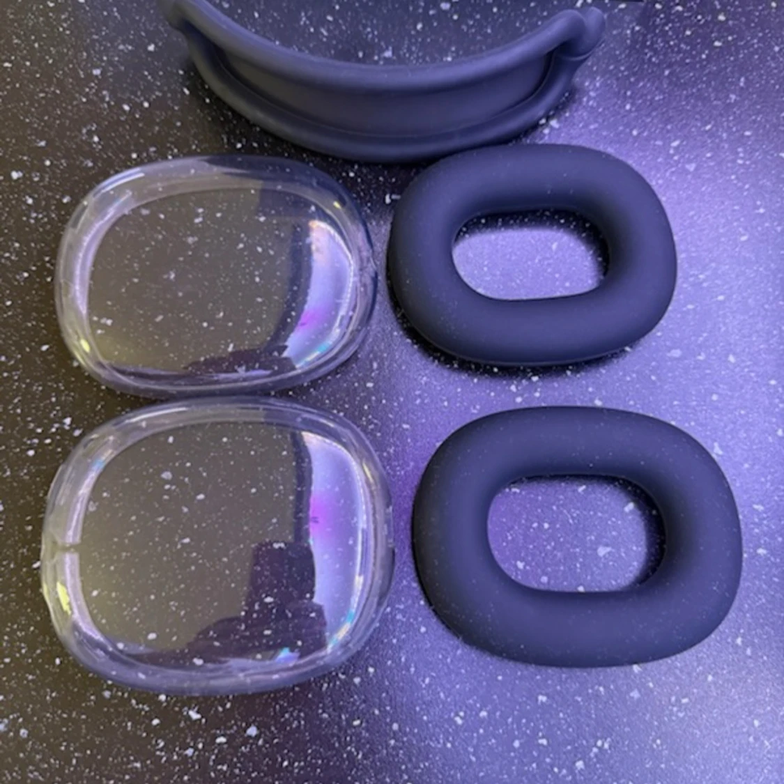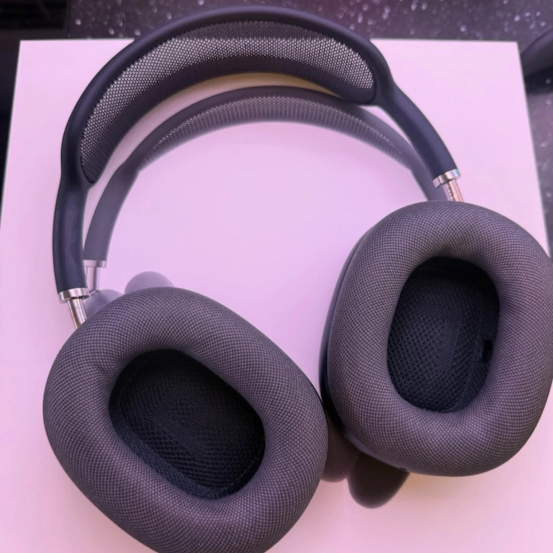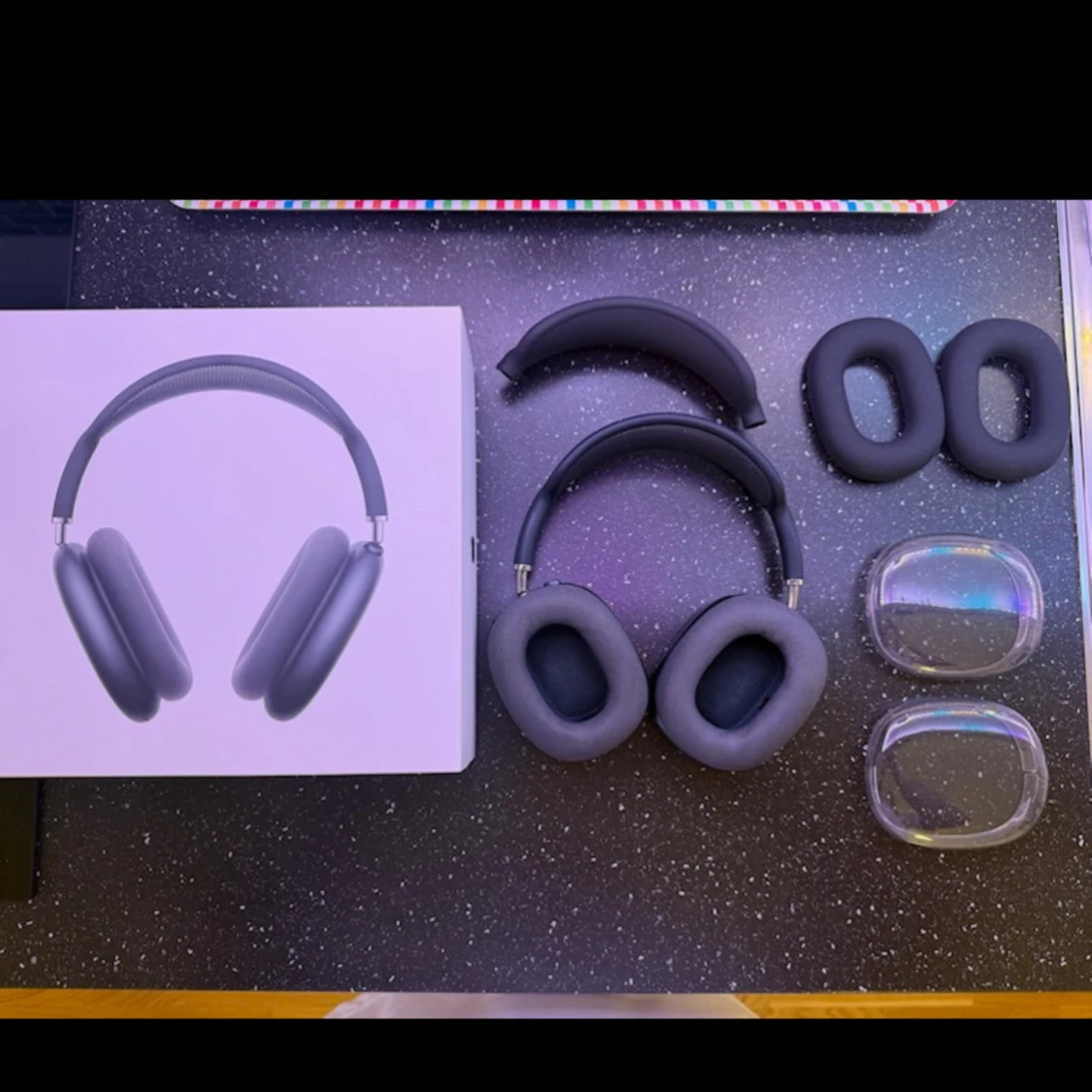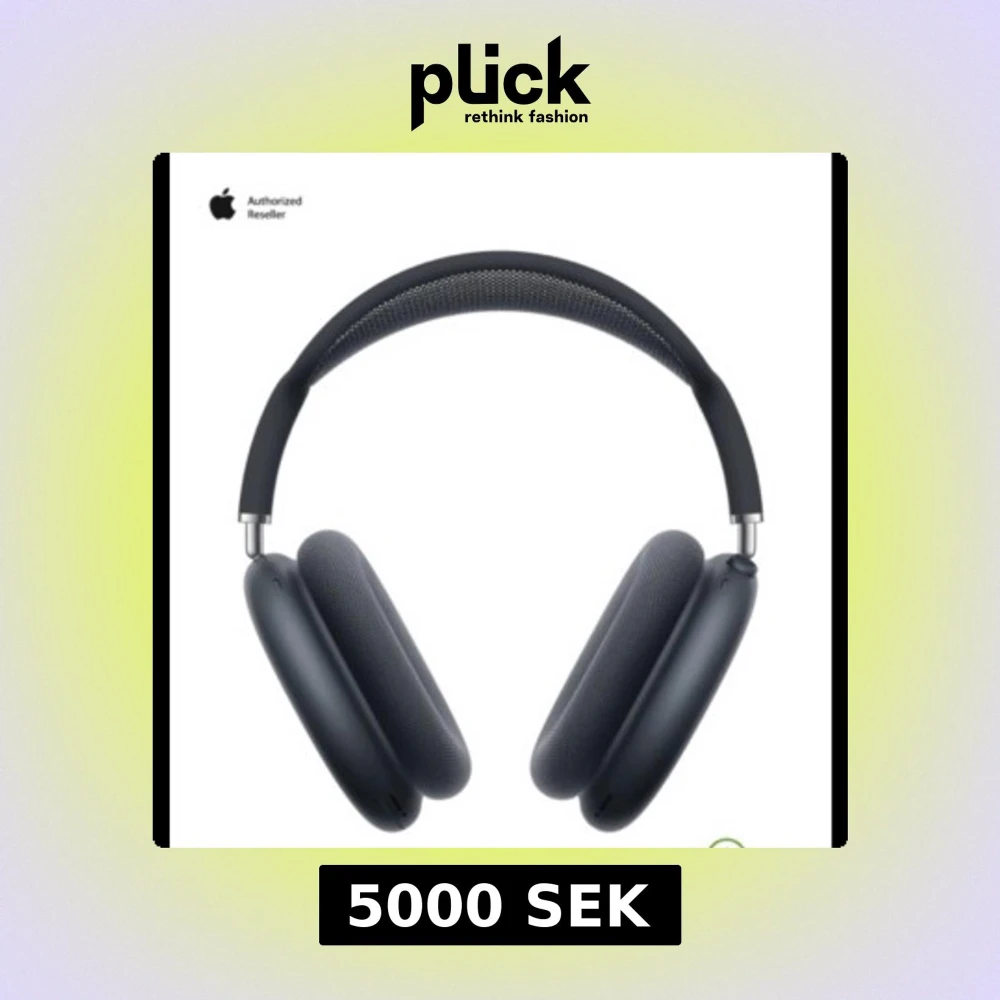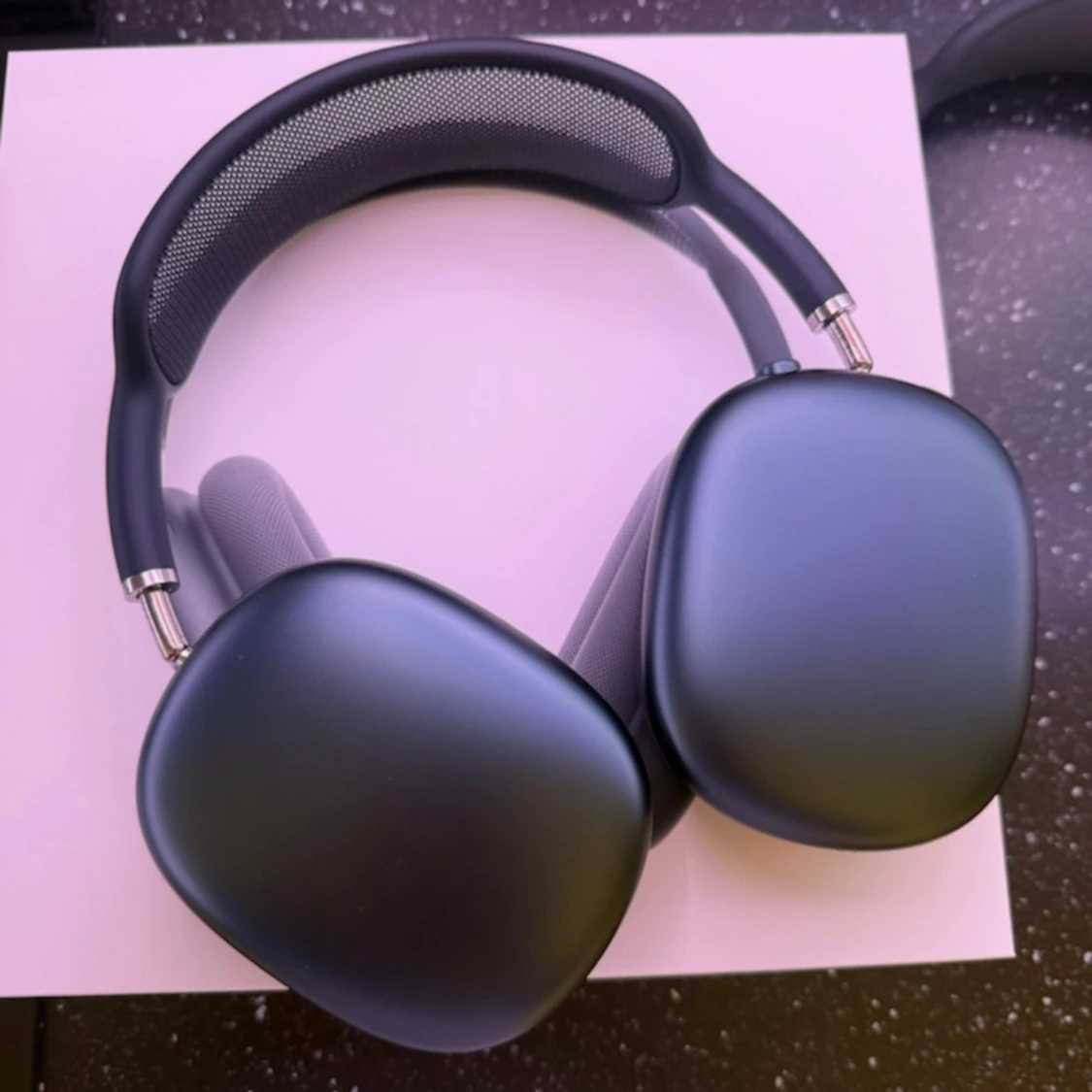Apple AirPods Max i svart färg, trådlösa over-ear hörlurar med aktiv brusreducering. Komplett med originalförpackning, extra öronkuddar och skydd. Hörlurarna ser ut att vara i mycket gott skick utan synligt slitage eller defekter. Perfekt för musik, film och samtal.