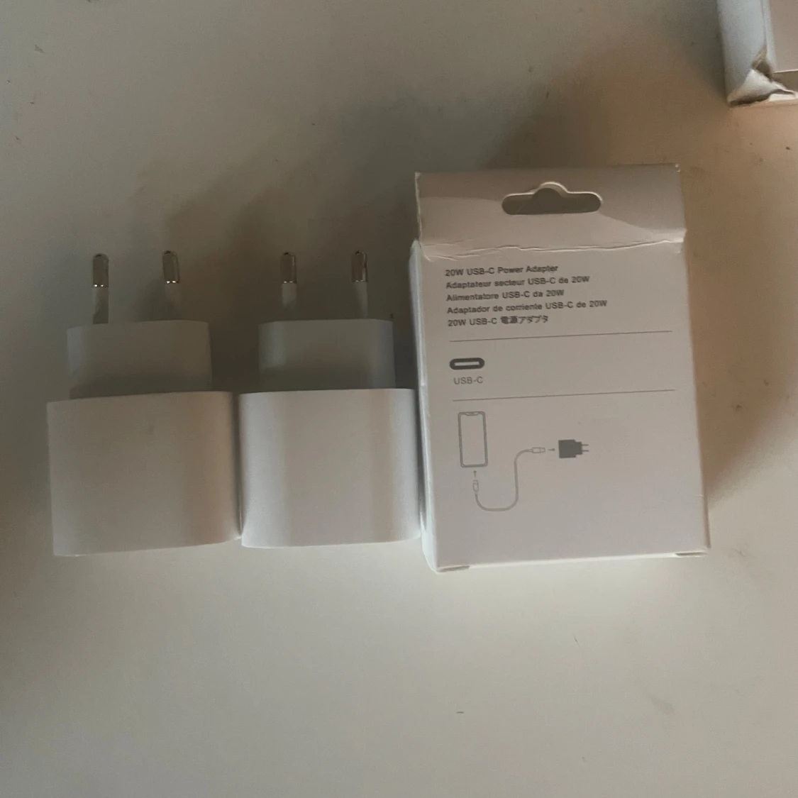Apple USB-C 20W Power Adapter, perfekt för snabb laddning av iPhone och iPad. Kompatibel med alla USB-C-enheter. Adaptrarna är i gott skick och levereras med originalförpackning. Inga synliga defekter eller slitage.