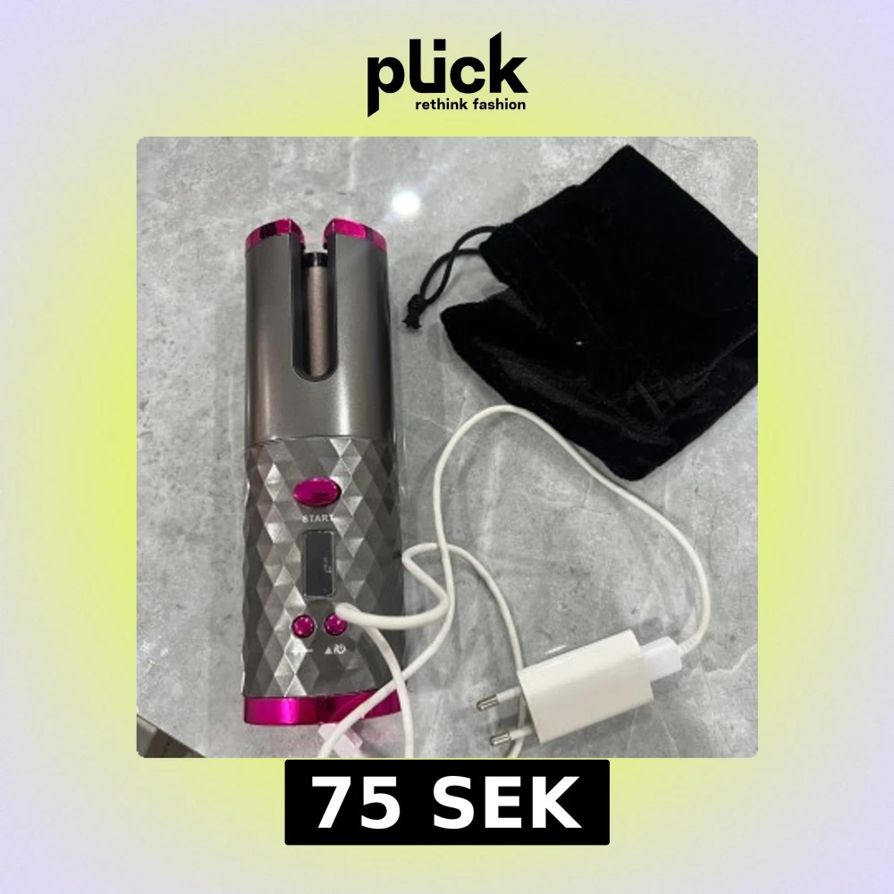Snygg och modern automatisk hårlocktång med trådlös funktion, laddningskabel och förvaringspåse. Grå och rosa design med digital display och flera inställningsknappar.