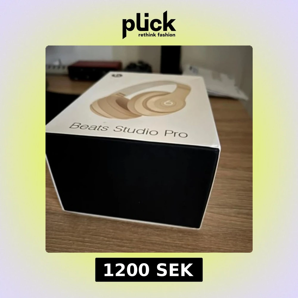 Beats Studio Pro over-ear hörlurar i beige, levereras i originalförpackning med hårt fodral. Trådlösa med upp till 6 timmars samtalstid, 10 meters räckvidd och 2 timmars laddningstid. Ser ut att vara i nyskick, plasten sitter kvar på bygeln.