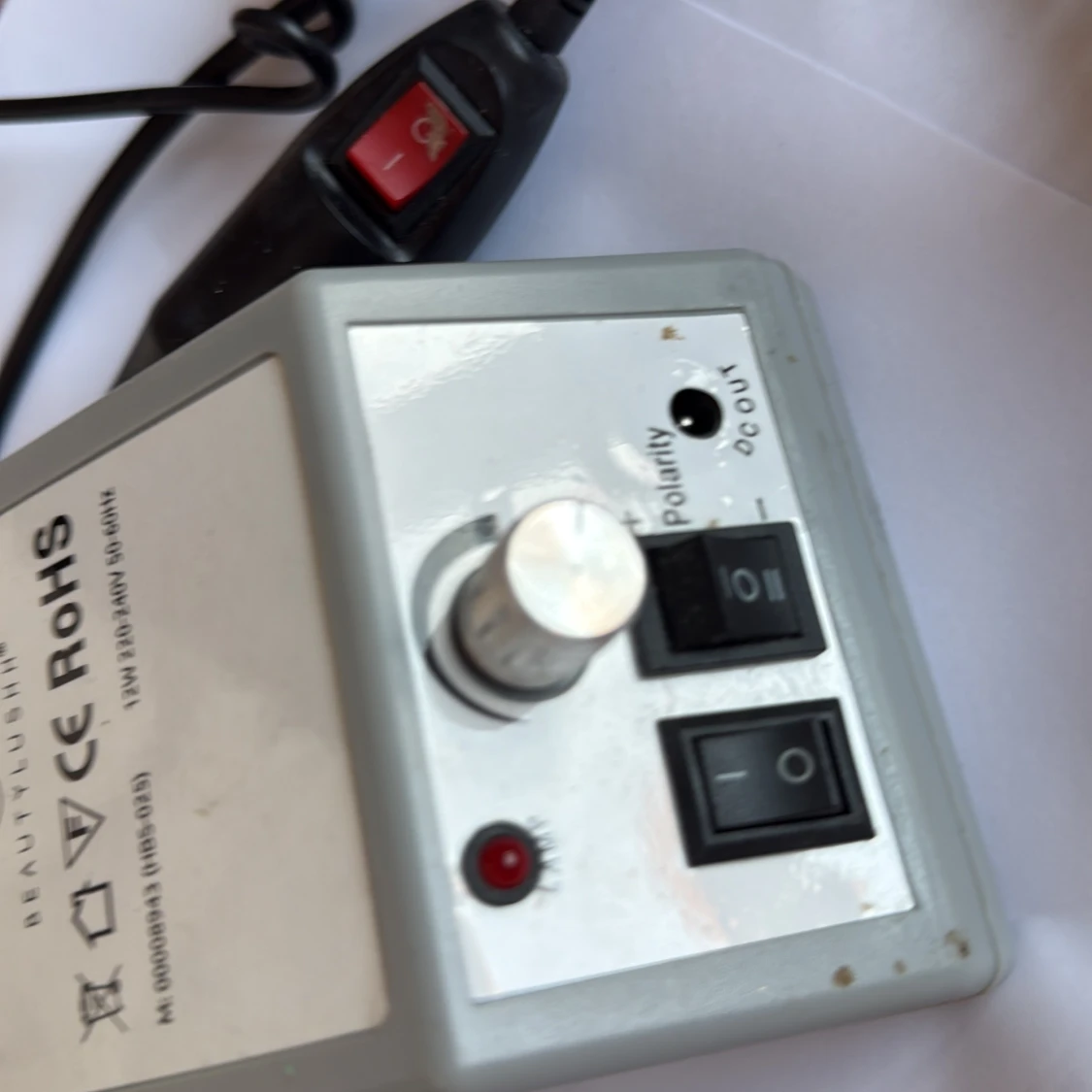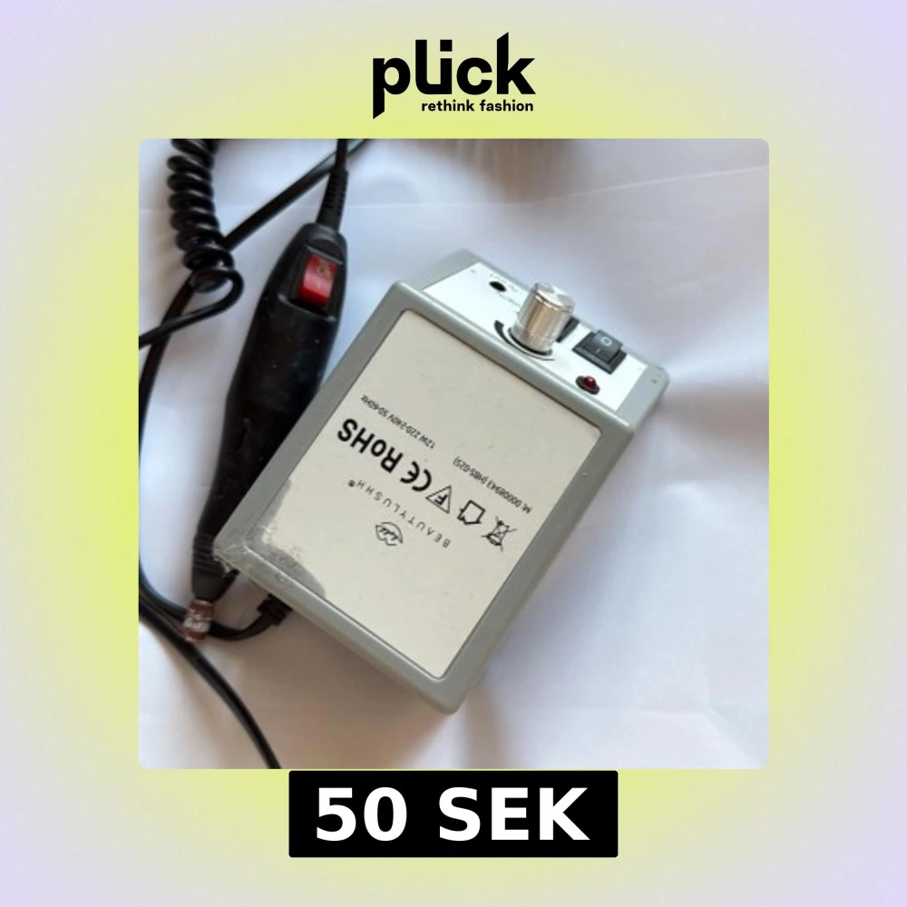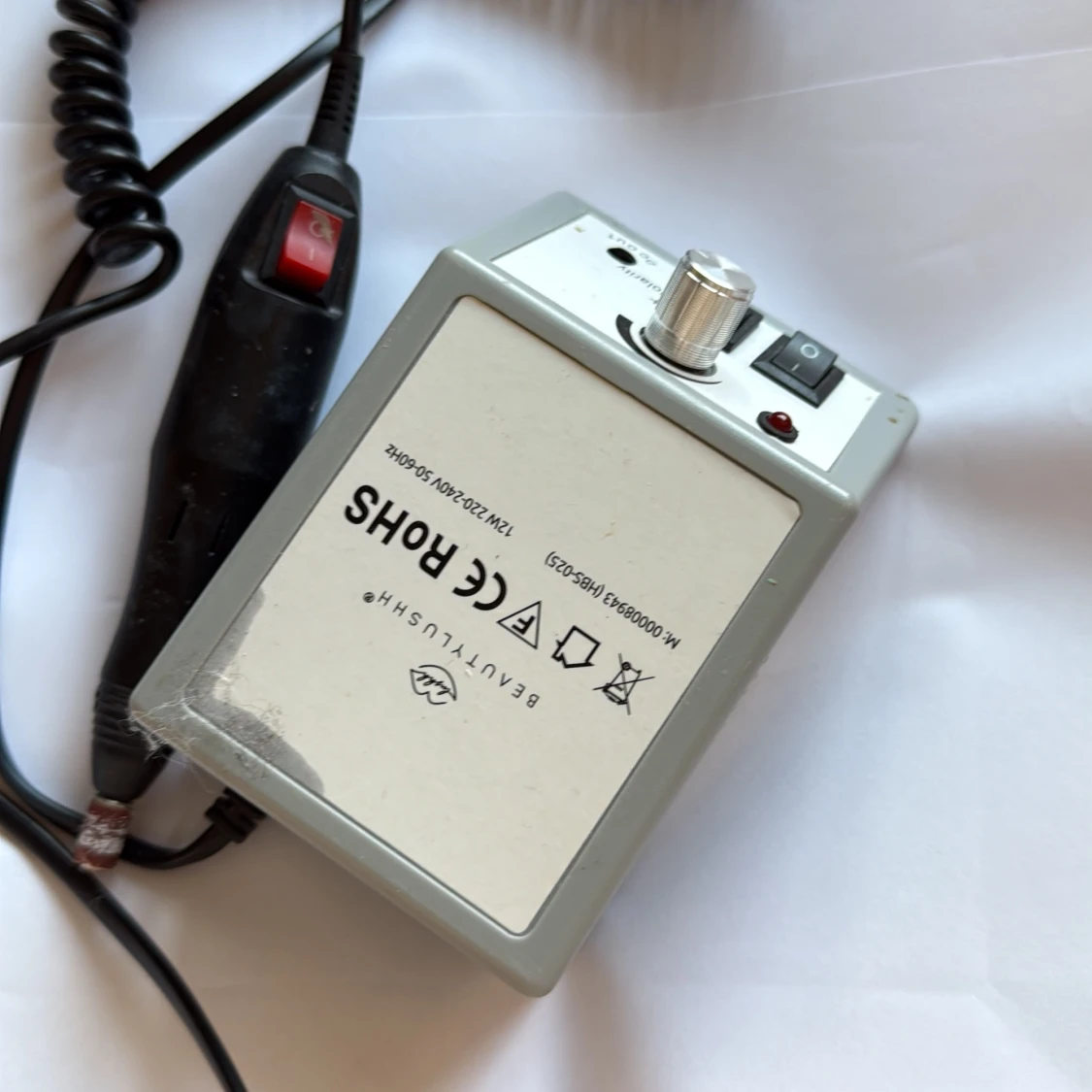 Elektrisk nagelfil från BEAUTYLUSHH, modell MK-0008043. Utrustad med justerbar hastighet, strömbrytare och LED-indikator. Synligt bruksslitage och repor på höljet, men i fungerande skick. Perfekt för manikyr och pedikyr hemma.
