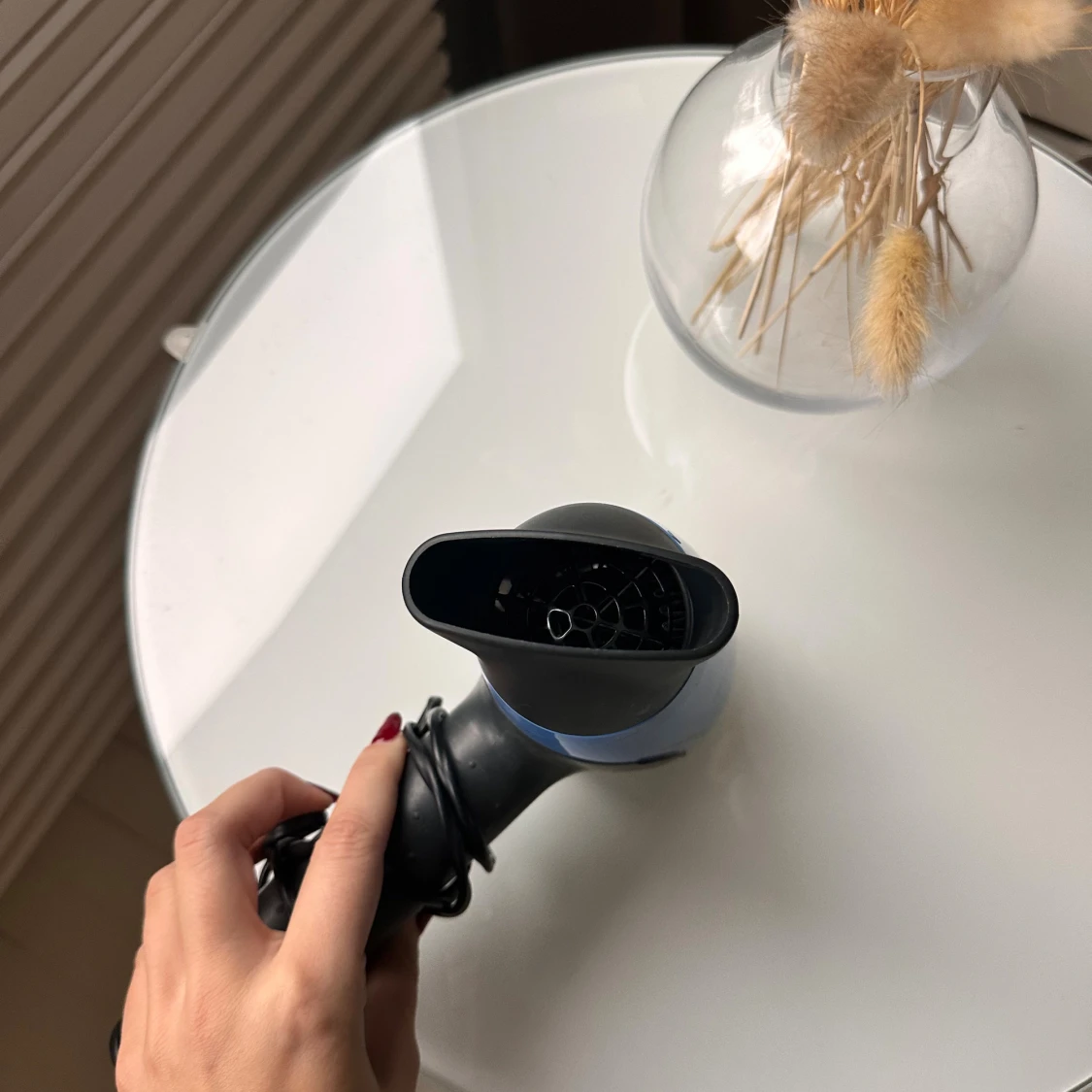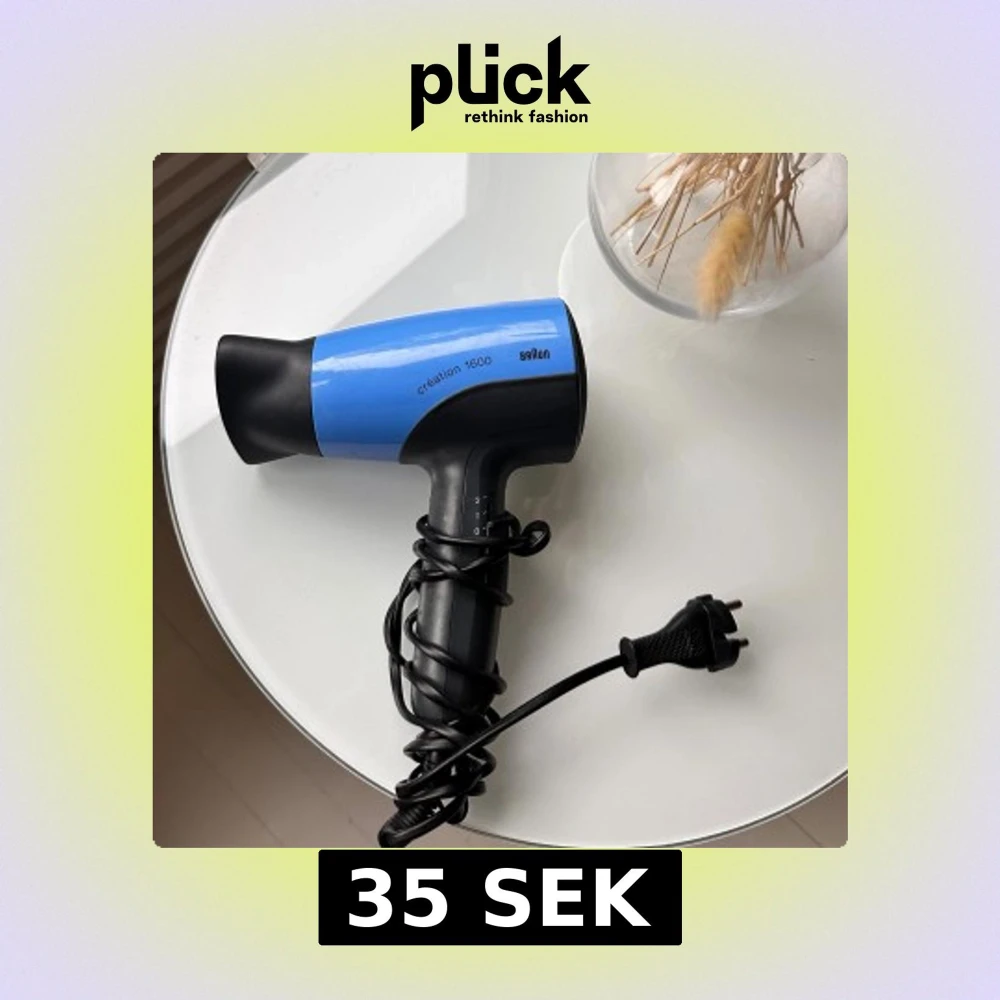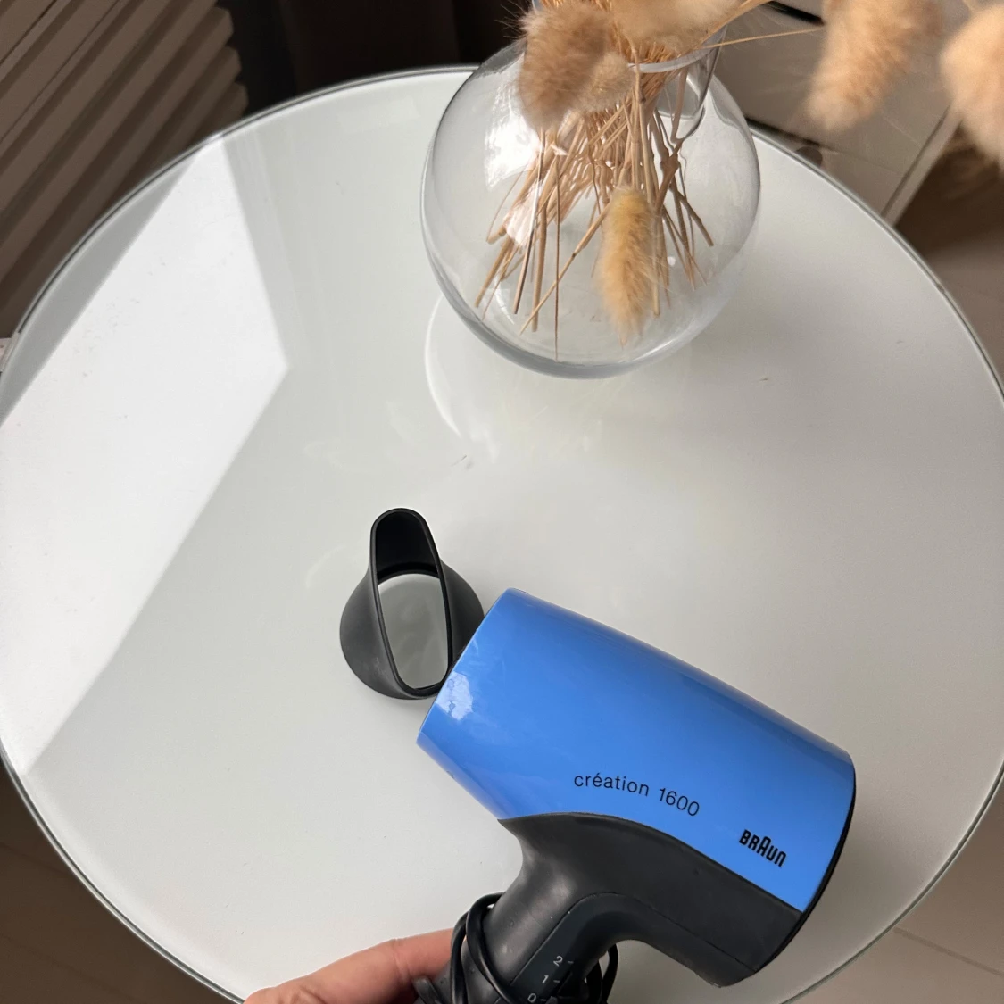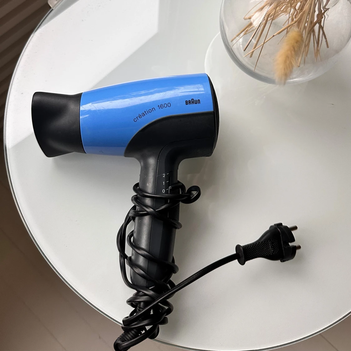 Kraftfull hårfön Braun Création 1600 i blått och svart. Utrustad med avtagbart munstycke och två hastighetsinställningar. Sladden och kontakten är i gott skick, och inga synliga defekter eller större slitage.