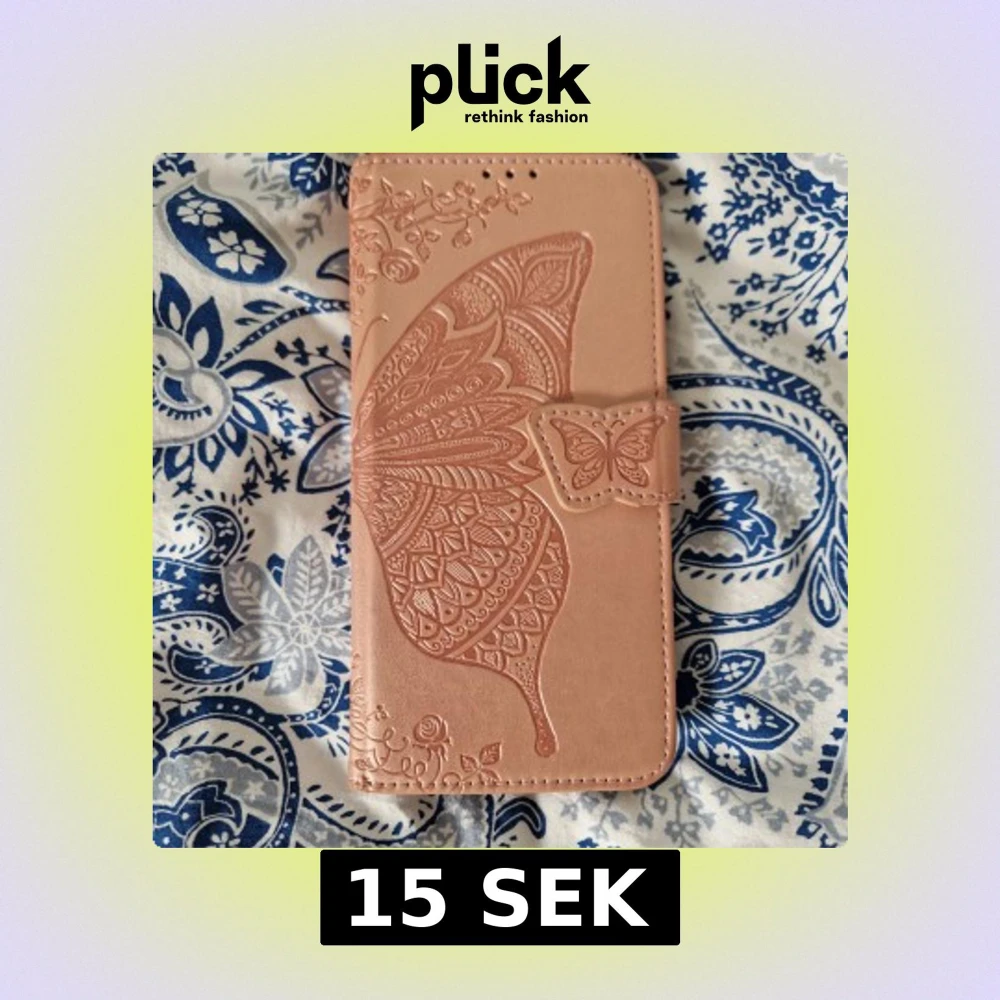 Elegant rosa plånboksfodral med vackert fjärilsmönster Fodralet har 4 kortplatser och magnetlås. Skicket är bra men har använts.