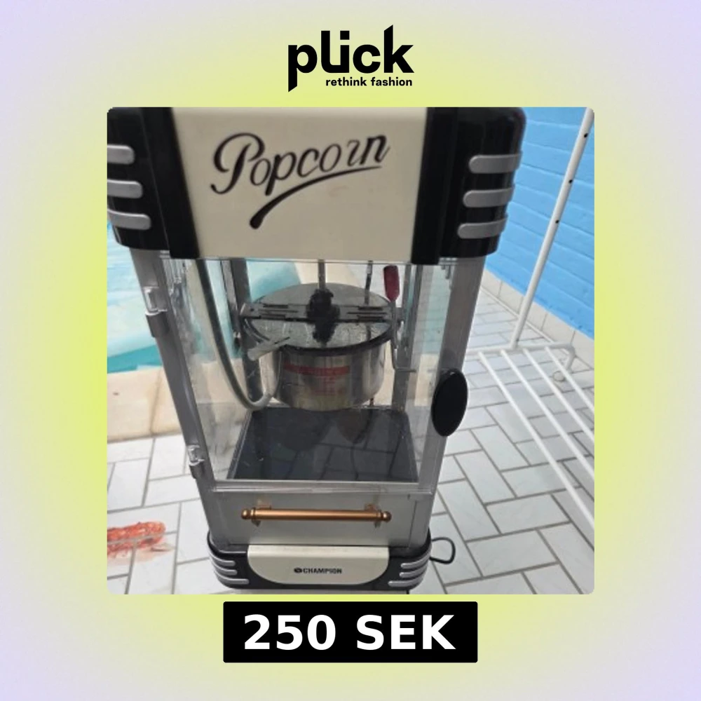 Popcornmaskin från Champion i retrodesign. Perfekt för hemmabio eller fest. Maskinen har en inbyggd gryta och glasdörrar. Synligt bruksslitage men fungerar bra. Enkel att använda och rengöra.