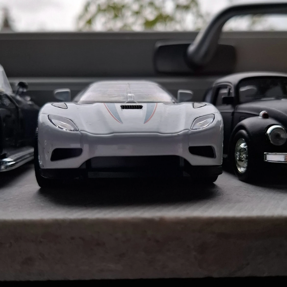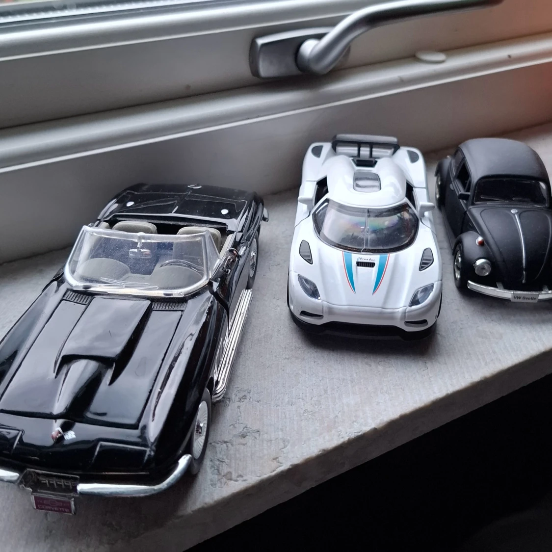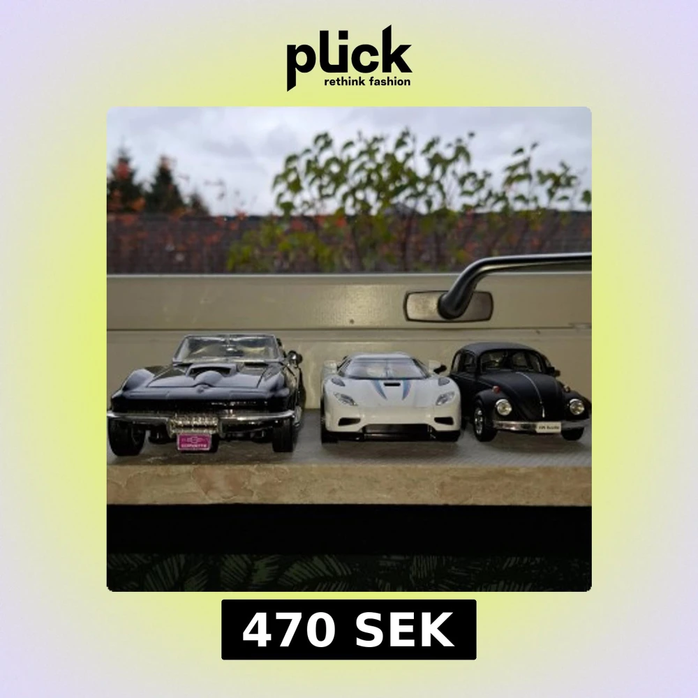 Bilderna visar tre modellbilar: en Chevrolet Corvette 1967, en Koenigsegg och en VW Beetle. Dessa är samlarbilar i miniatyrformat och inte elektronikprodukter.
