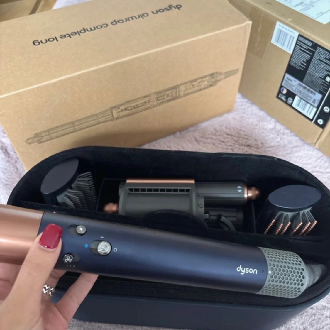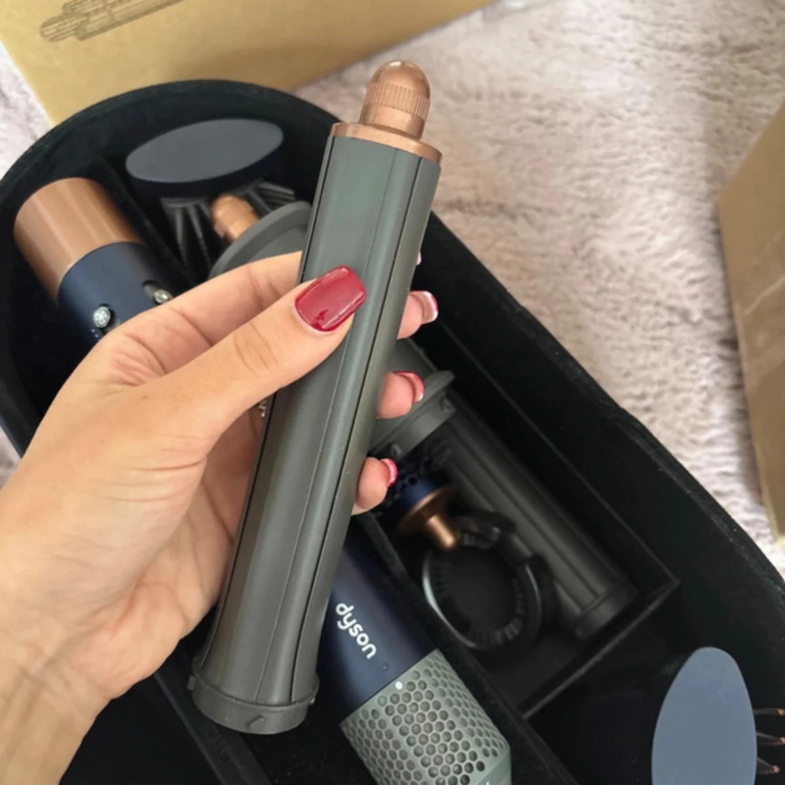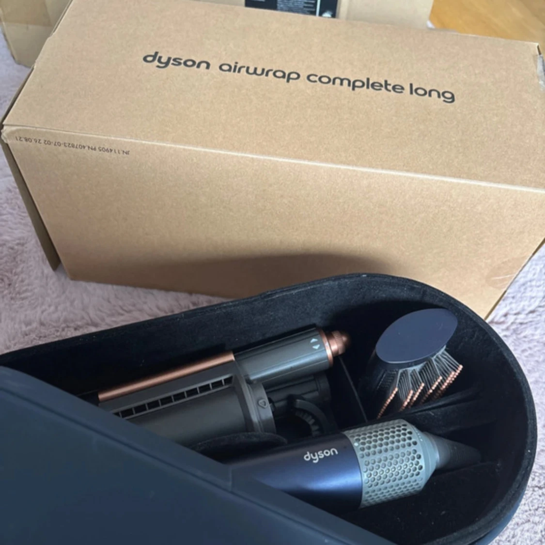 Dyson Airwrap Complete Long HS05 i färgen dark blue/copper. Kommer i originalförpackning med flera tillbehör och elegant förvaringsväska. Produkten ser ut att vara i mycket gott skick, utan synliga defekter eller slitage. Perfekt för styling och torkning av håret.