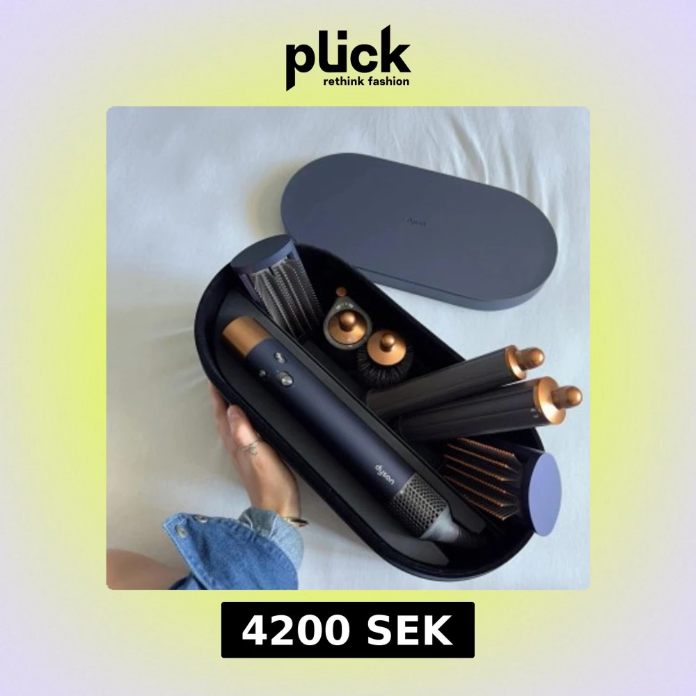 Dyson Airwrap Complete i elegant blå/guld, med flera stylingtillbehör för lockar, volym och slätning. Helt ny i original förpackning. Perfekt för professionell hårstyling hemma.