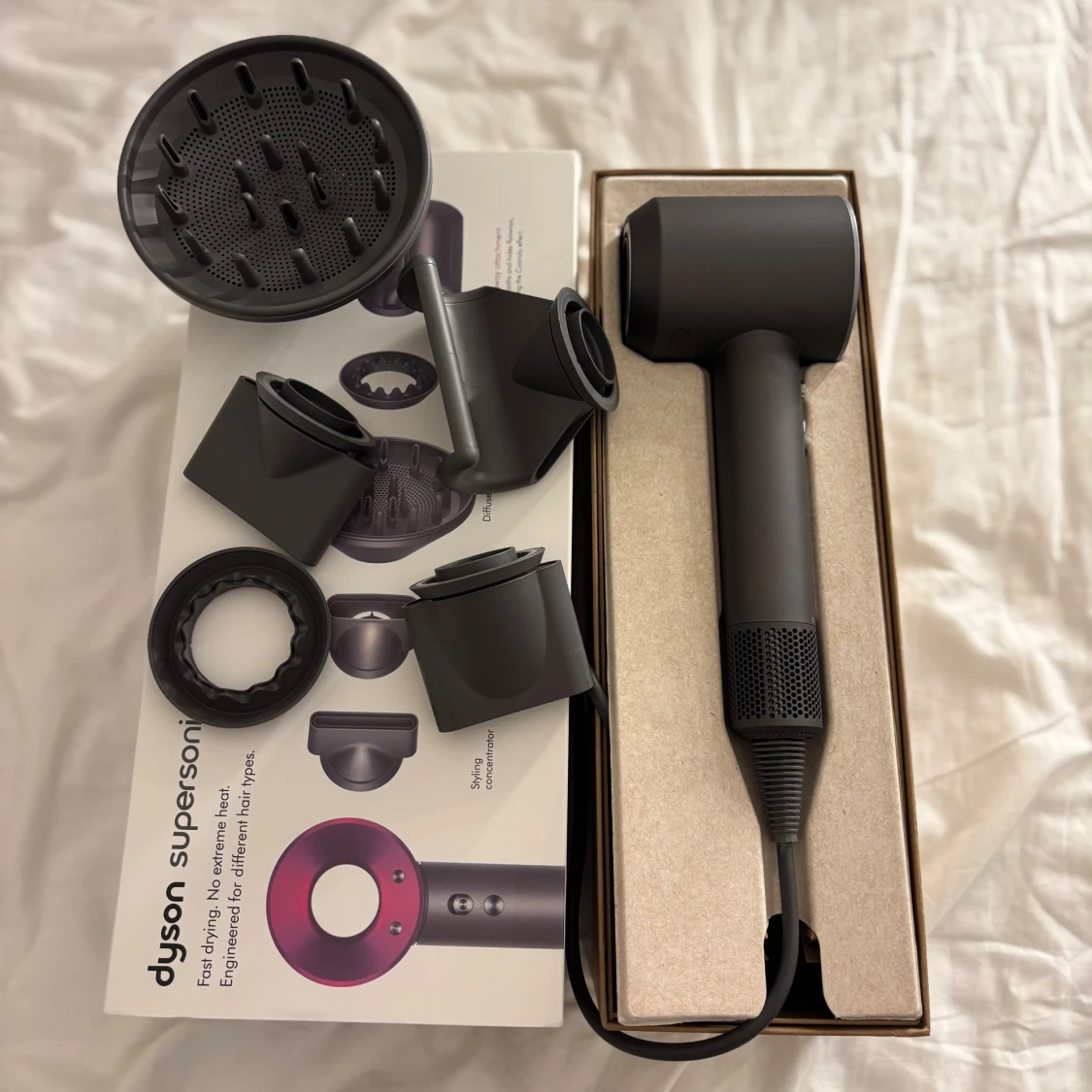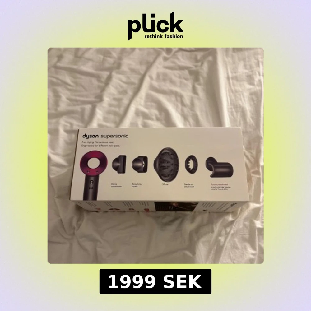 Dyson Supersonic hårfön i mycket fint skick, komplett med originaltillbehör: styling concentrator, smoothing nozzle, diffuser, gentle air och flyaway attachment. Snabb torkning utan extrem värme, passar alla hårtyper. Inga synliga defekter eller slitage, levereras i originalförpackning.