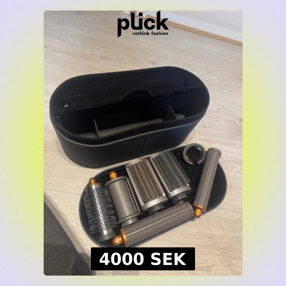 Dyson Airwrap Complete med flera stylingtillbehör och originalförvaringsväska. Flera borstar och locktillbehör ingår. Produkten ser ut att vara i mycket gott skick utan synligt slitage. Perfekt för att skapa olika frisyrer med minimal värmeskada.
