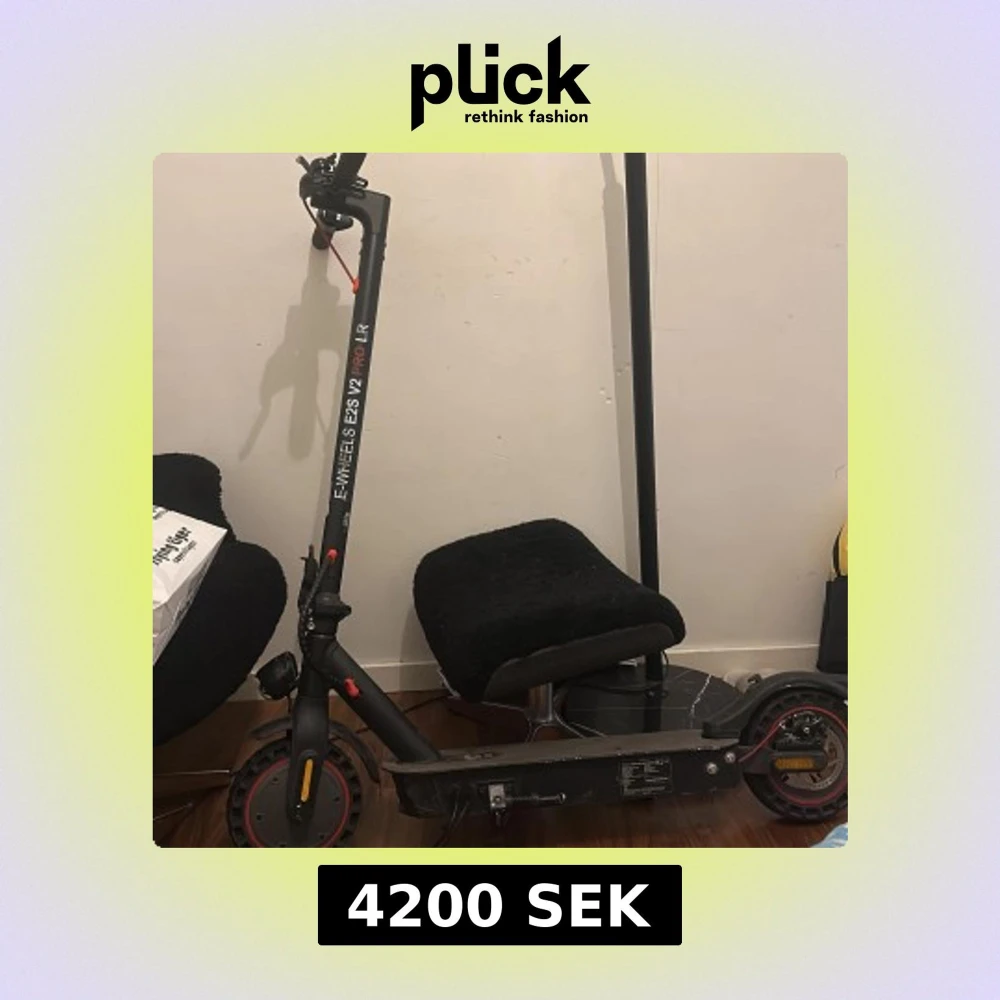 E-Wheels E2S V2 Pro LR elscooter med digital display, maxhastighet 30 km/h och lång räckvidd. Skärmen visar batterinivå och hastighet. Något slitage syns på fotplattan, men i övrigt gott skick. Perfekt för pendling och stadskörning. Kvitto finns.