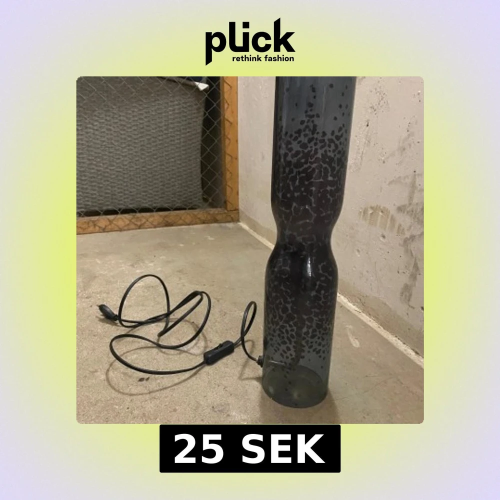 Modern elektrisk lampa med svartmönstrad glasdesign och strömbrytare på sladden. Lampan är hög och cylinderformad, perfekt som dekorativ belysning. Mindre bruksspår men i gott skick. Glödlampa och exakt märke saknas.