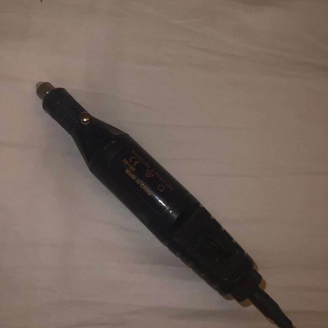 Elektrisk nagelfil för manikyr och pedikyr, drivs via USB. Justerbar hastighet med reglage, passar för både hemmabruk och salong. Svart färg, synligt i gott skick utan större slitage. Perfekt för nagelvård och formning.