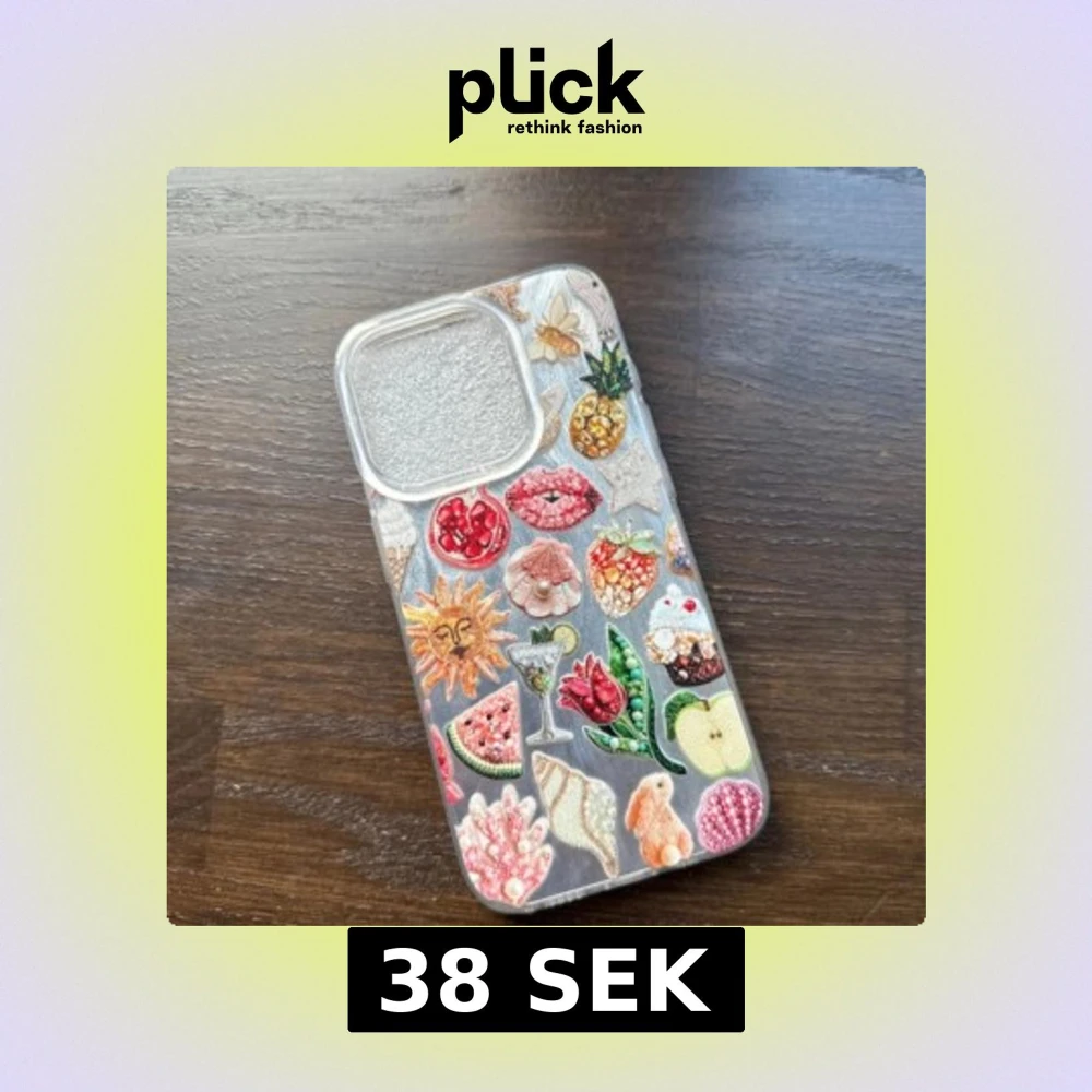Unikt mobilskal till iPhone med färgglada broderade motiv som frukter, blommor och sol. Skalet är i gott skick utan synliga repor eller skador. Perfekt för dig som vill ge din telefon ett personligt och lekfullt utseende.