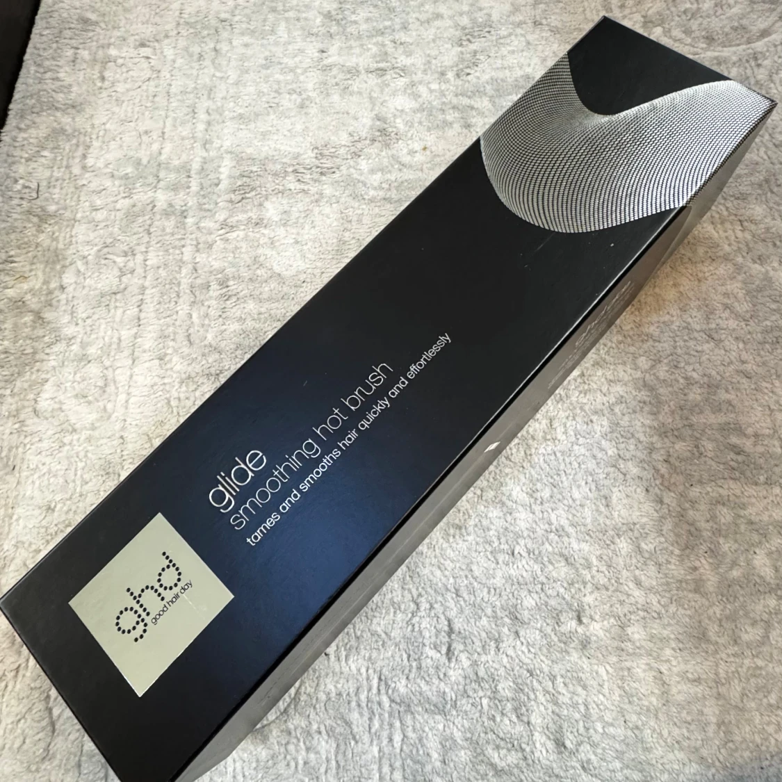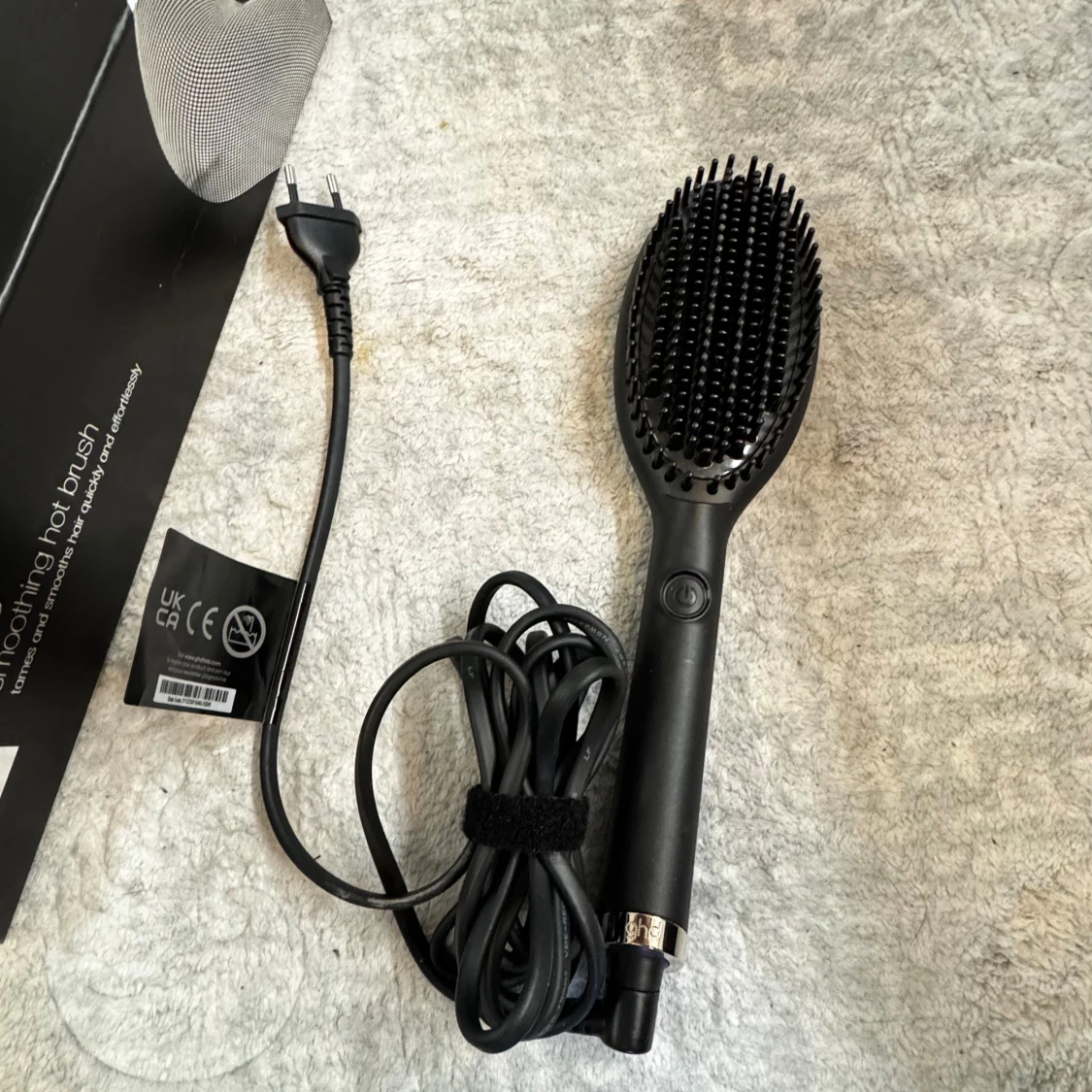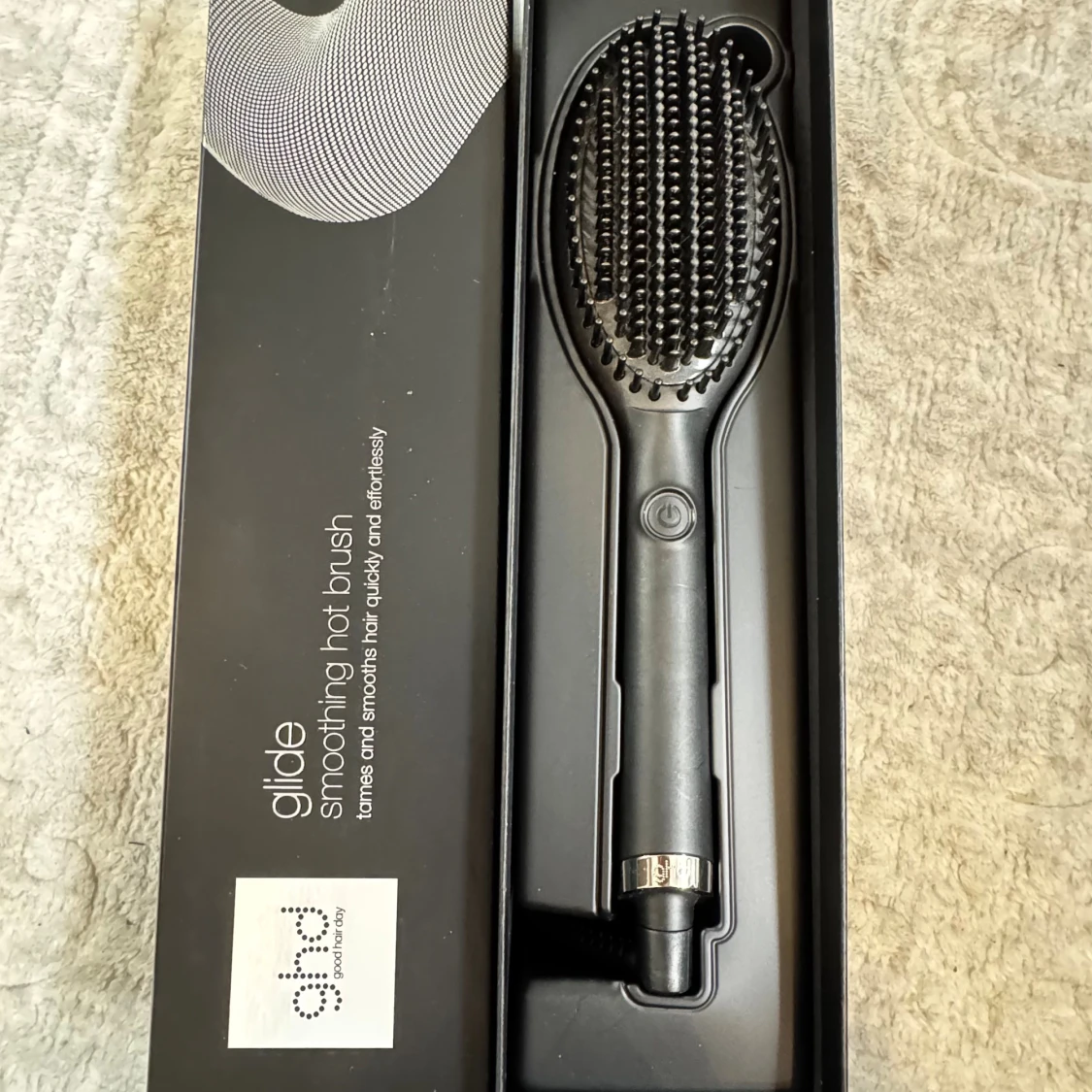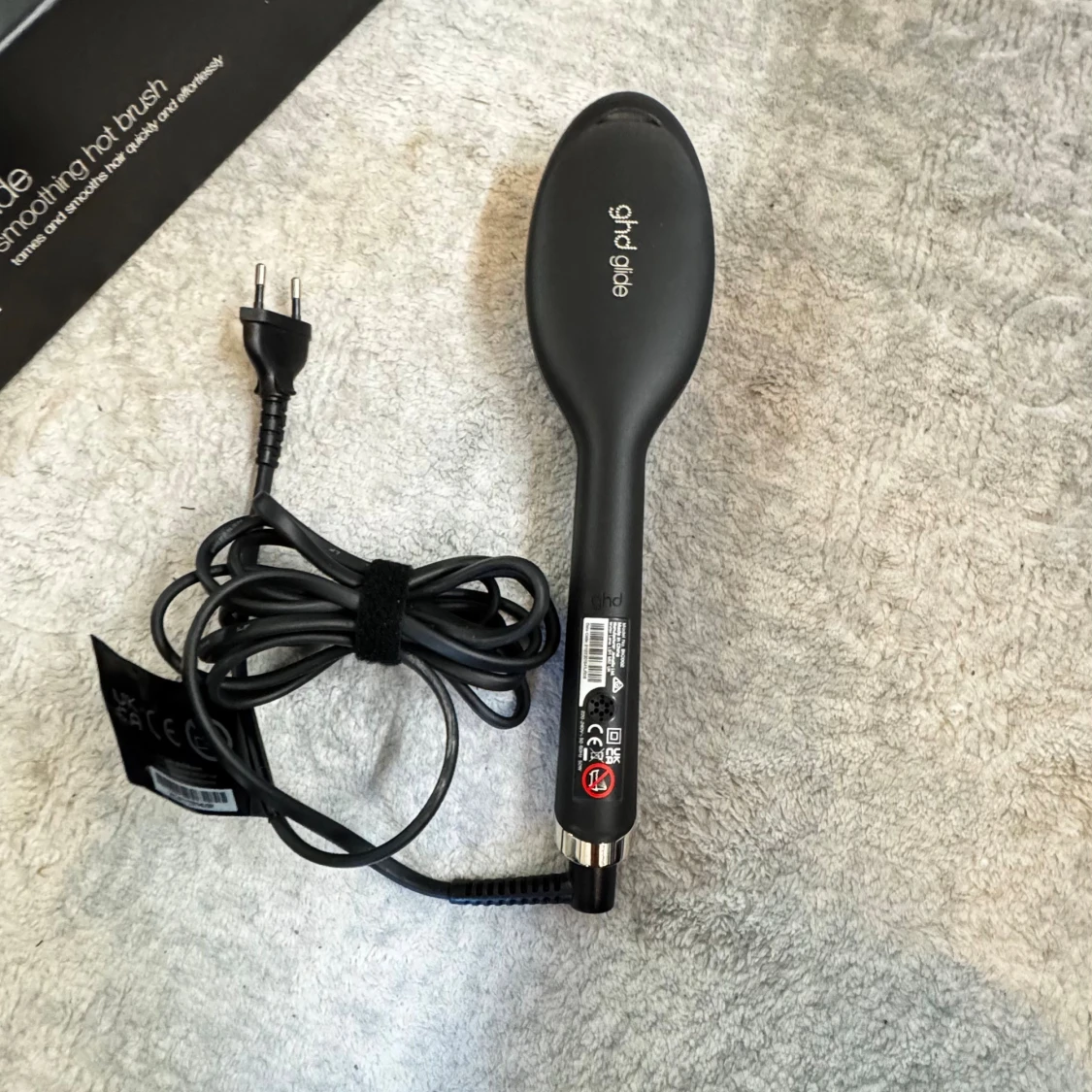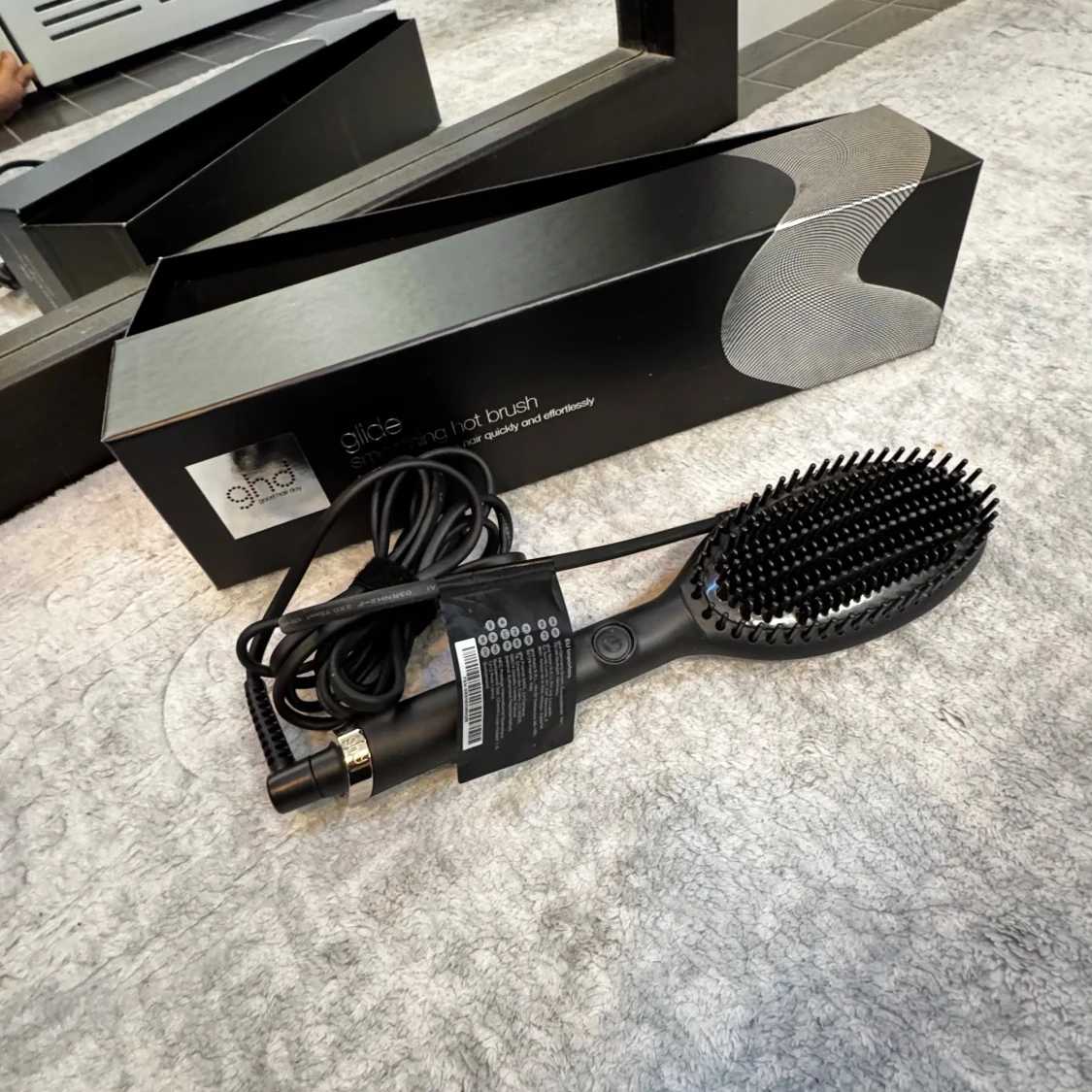 Ghd Glide Smoothing Hot Brush. Detta är en professionell värmeborste designad för att snabbt och enkelt tämja och släta ut torrt hår. Den använder keramisk teknologi med jonisator för att minimera frissighet och håller en optimal stylingtemperatur på 185 °C för att skydda håret. Borsten har en kombination av korta och långa borststrån med hög densitet, vilket gör det möjligt att styla större sektioner av håret och nå ända ner till rötterna för en slät och glansig finish. Endast provad!!!
