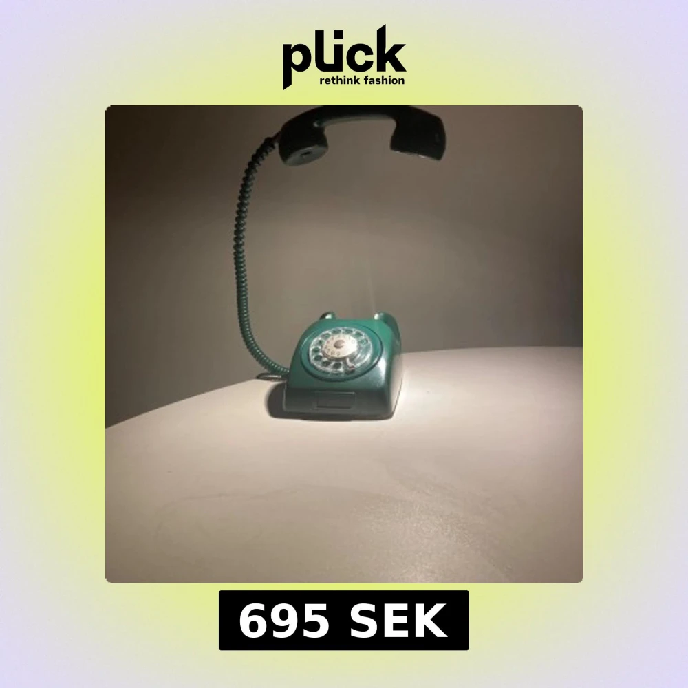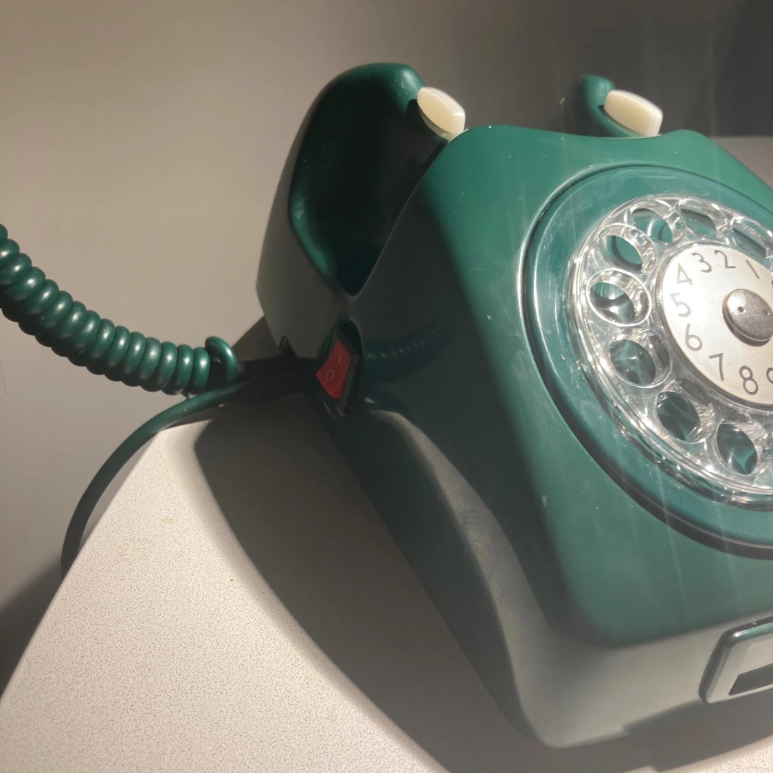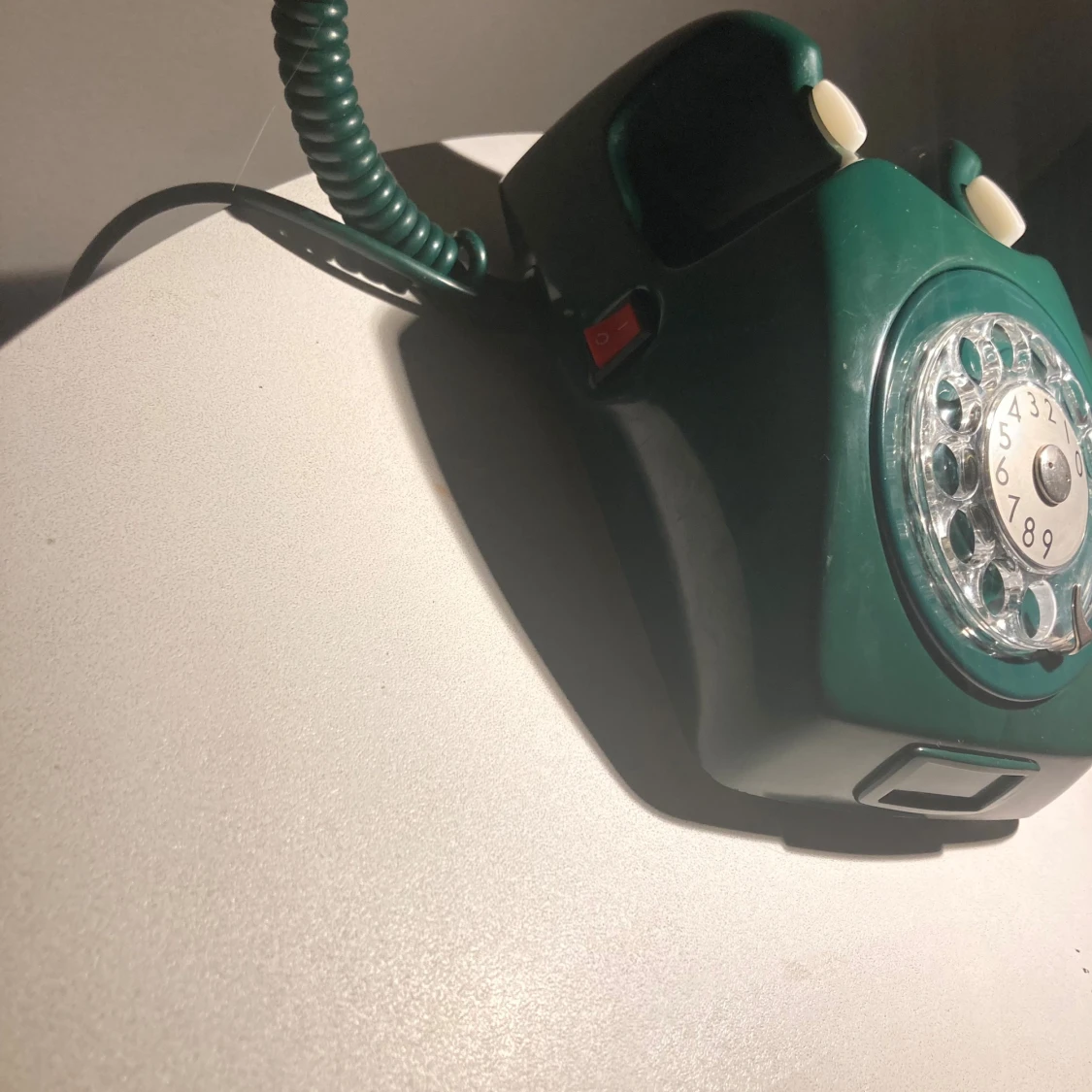 Klassisk grön bordstelefon med roterande nummerskiva och spiralsladd. Telefonen har en robust design och tydliga knappar. Mindre repor och bruksspår syns, men överlag gott skick. Perfekt för retroälskare eller som inredningsdetalj.