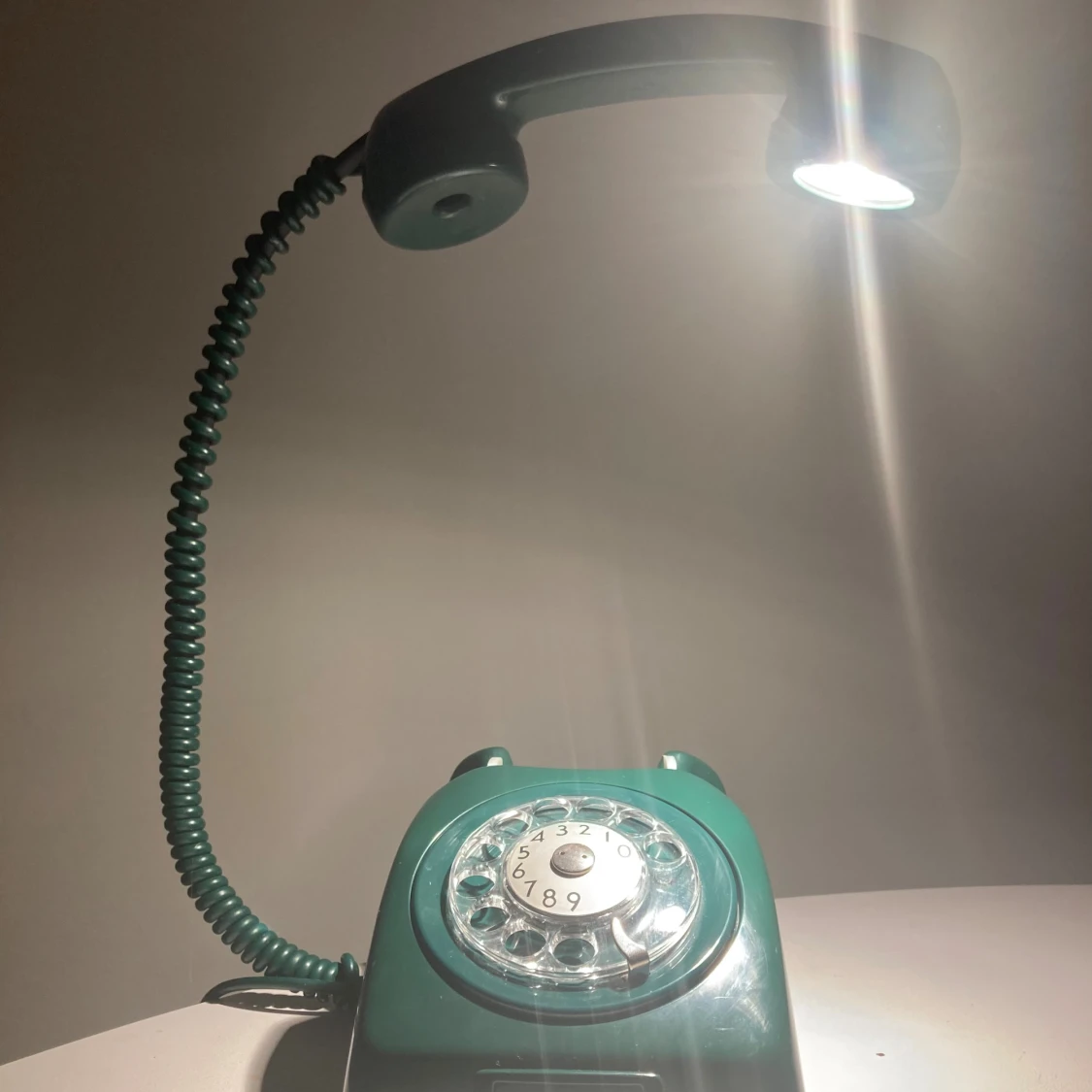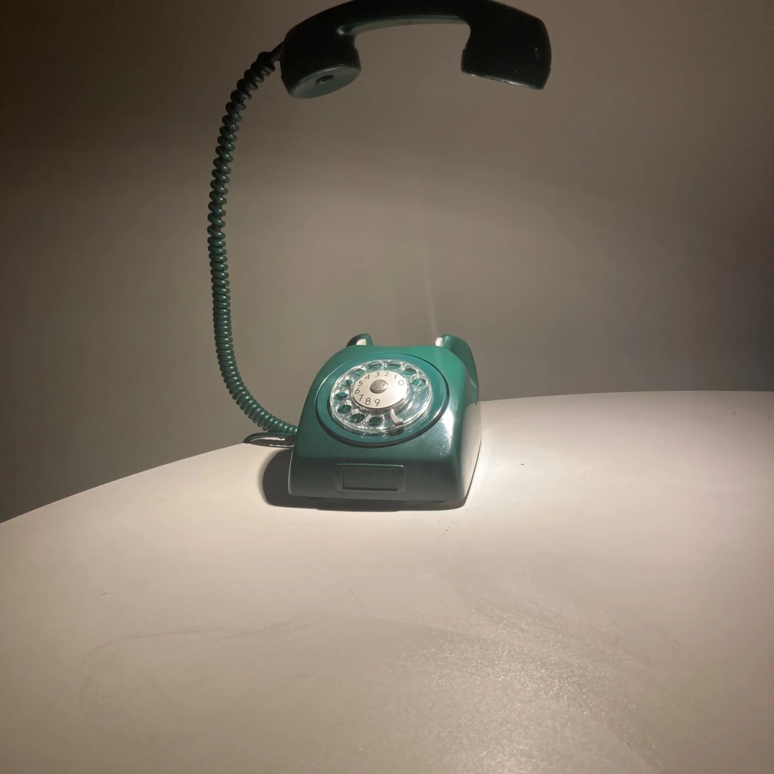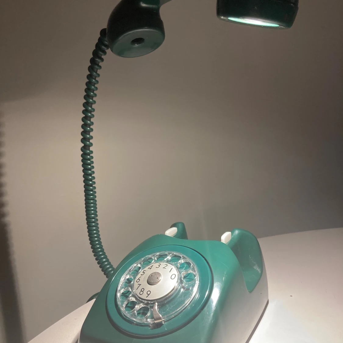 Klassisk grön bordstelefon med roterande nummerskiva och spiralsladd. Telefonen har en robust design och tydliga knappar. Mindre repor och bruksspår syns, men överlag gott skick. Perfekt för retroälskare eller som inredningsdetalj.