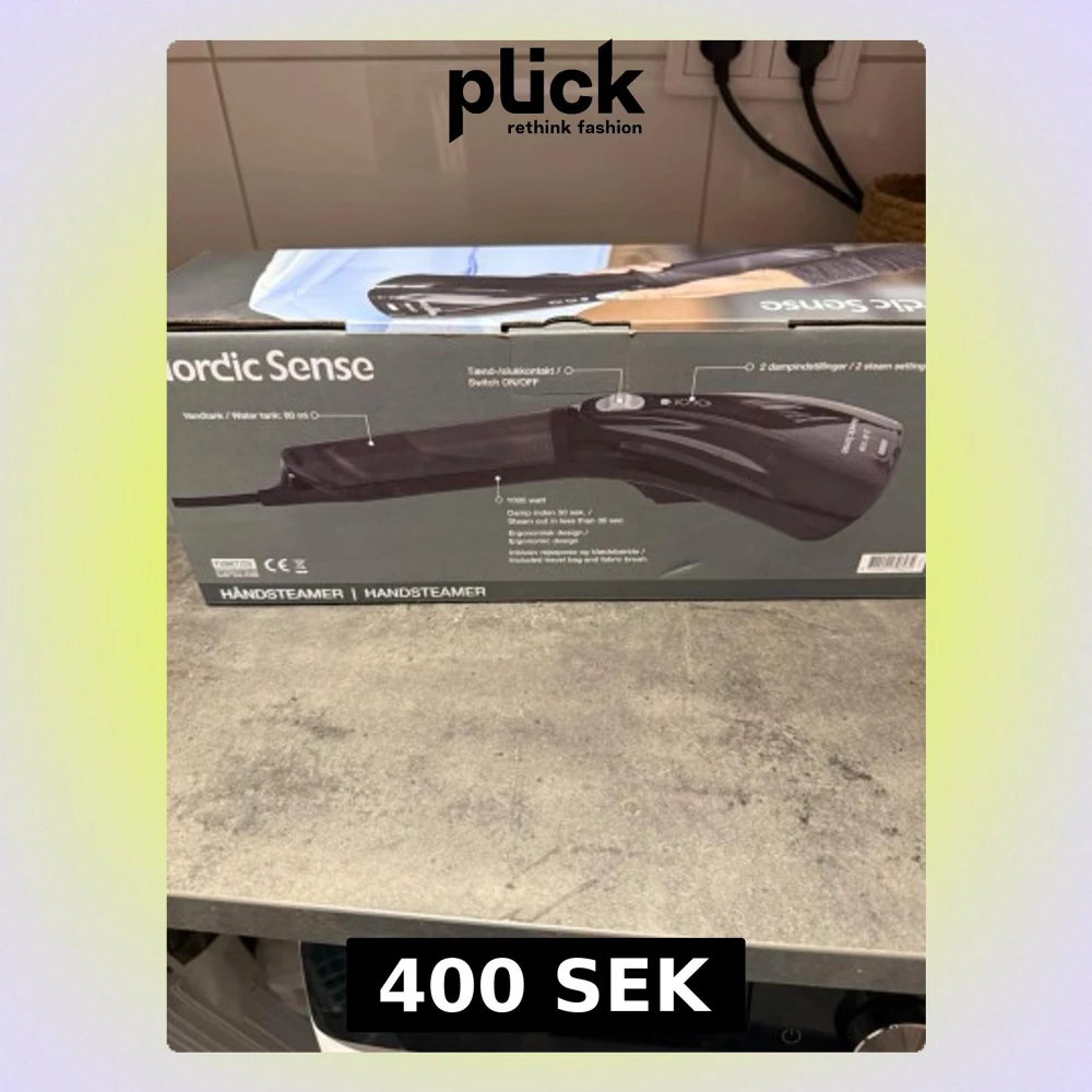 Nordic Sense Handsteamer med 1000 watt effekt, 80 ml vattentank och ergonomisk design. Ånga på mindre än 30 sekunder, två ånginställningar och medföljande tygborste och resepåse. Produkten ser ut att vara i nyskick, förpackningen är hel och ren.