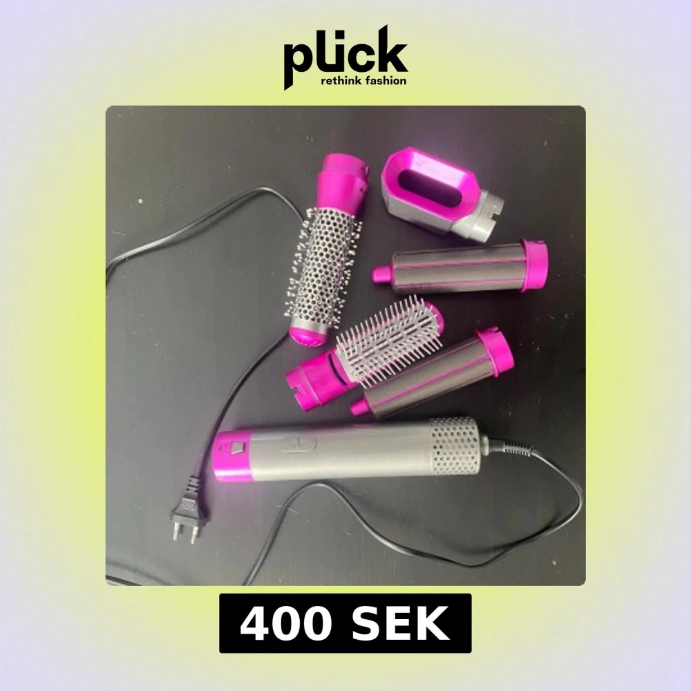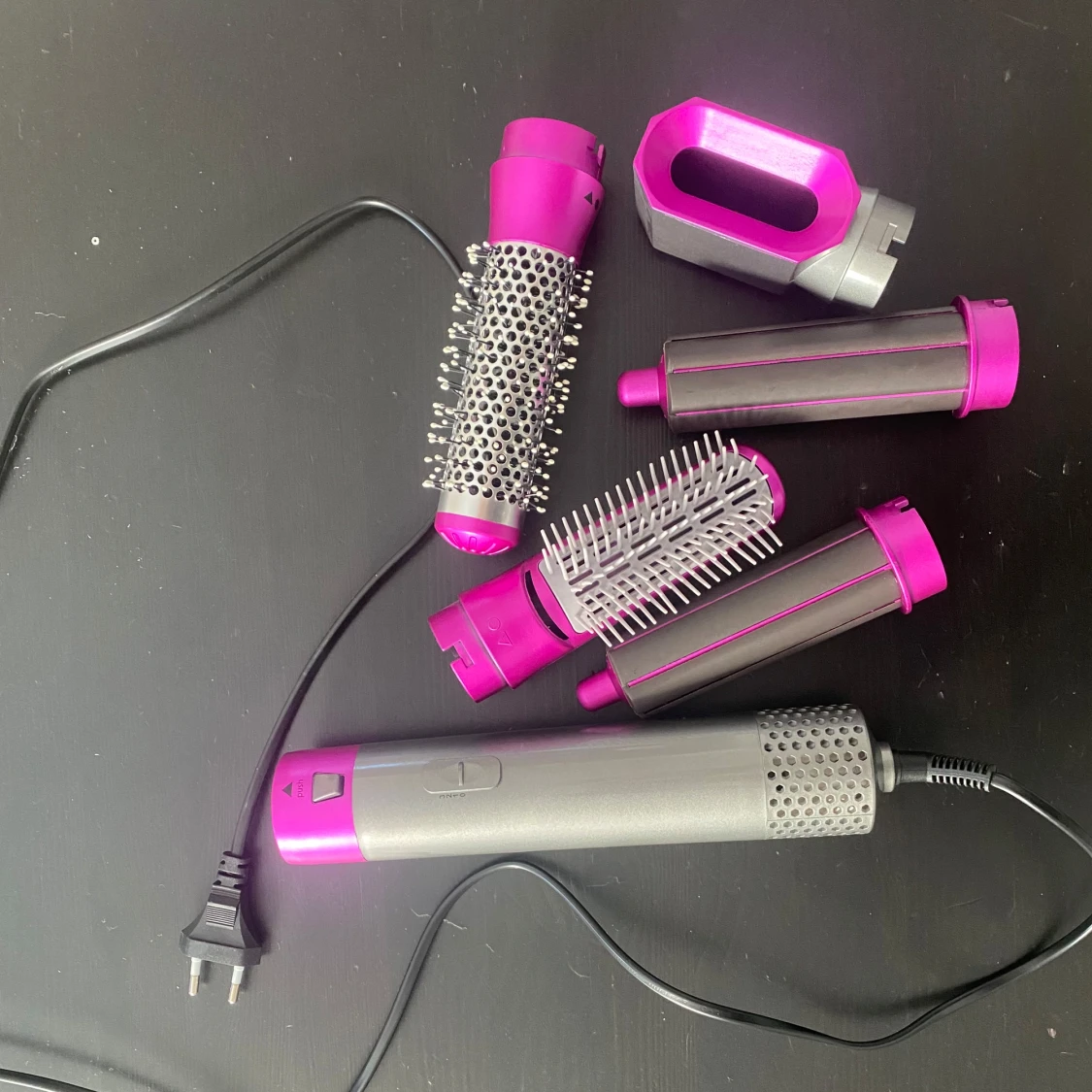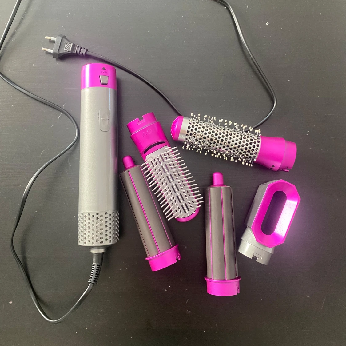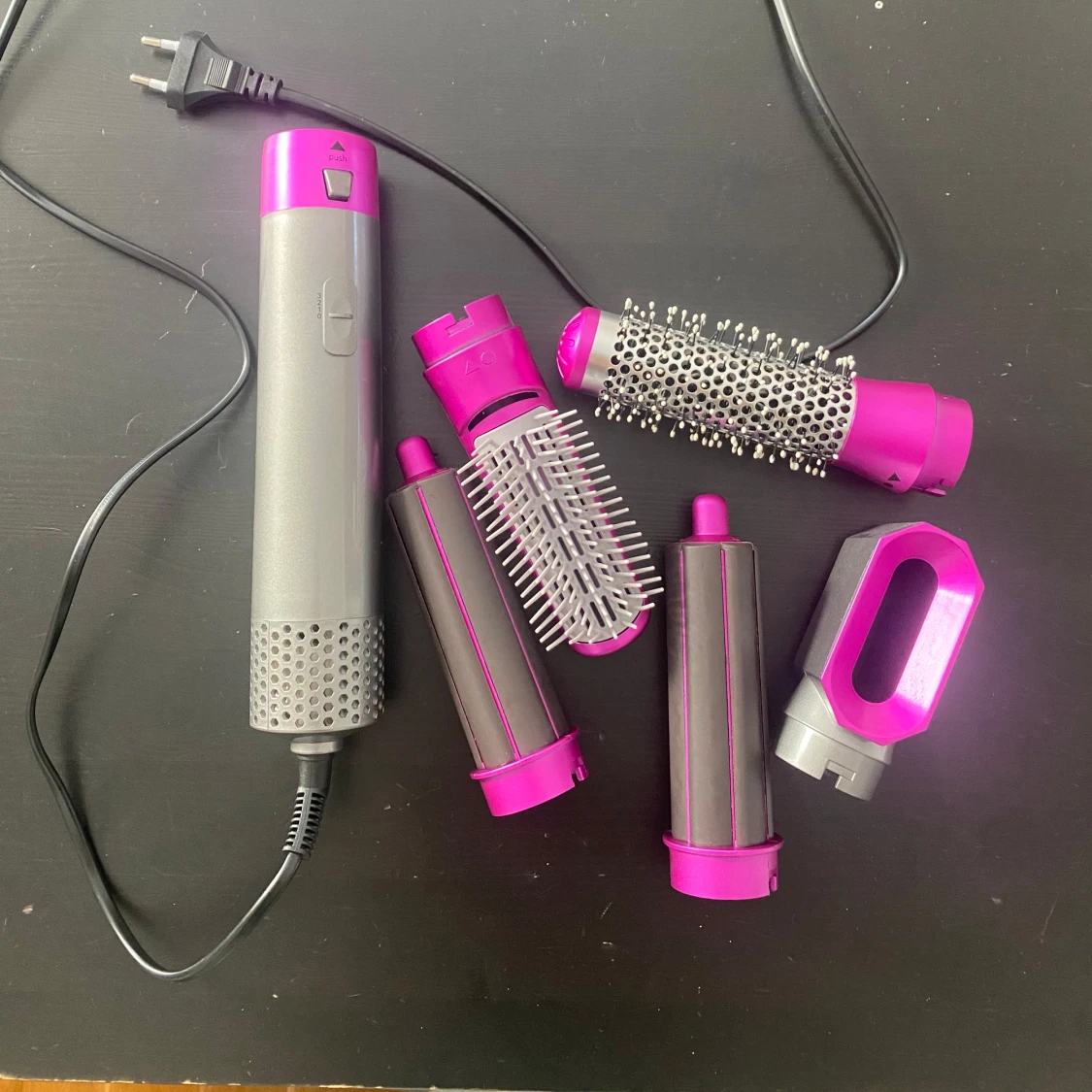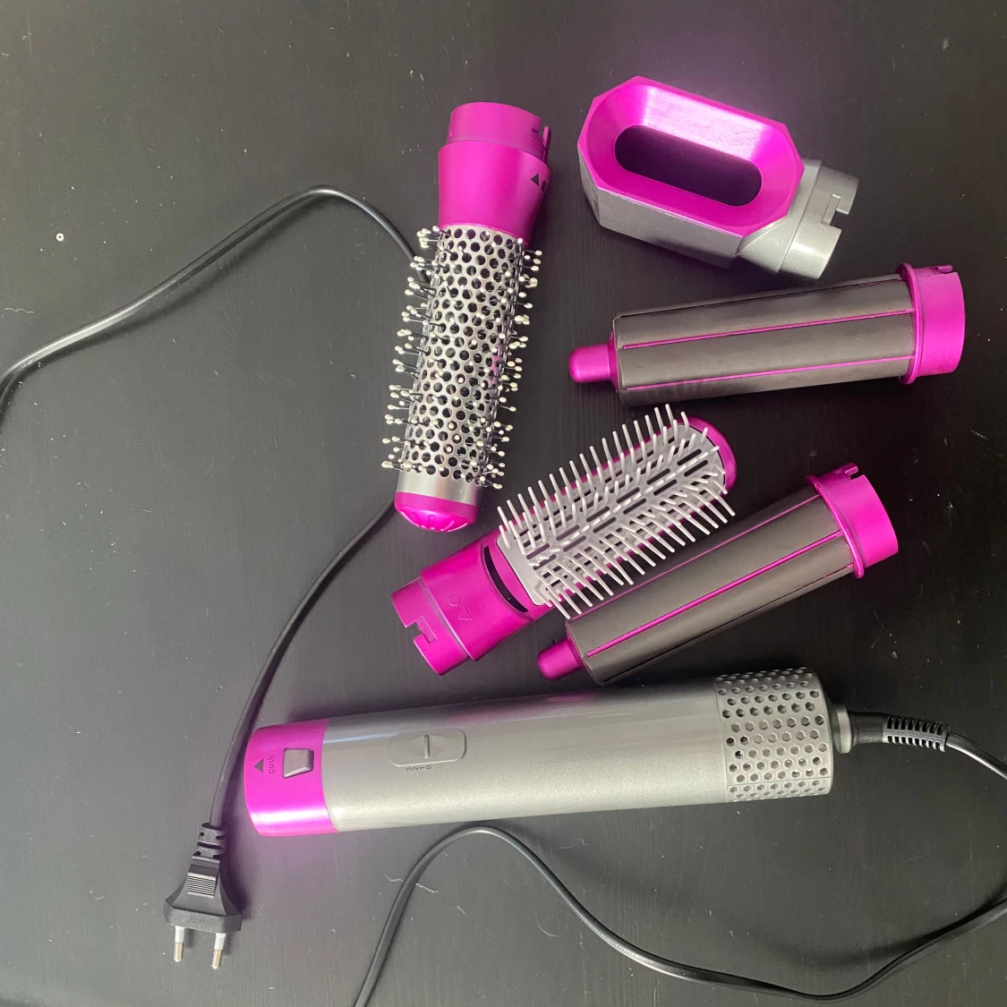 Multistyler hårverktyg i silver och rosa med fem utbytbara tillbehör för lockar, volym och borstning. Allt är i nytt skick. Perfekt för den som inte vill lägga pengar på en dyson