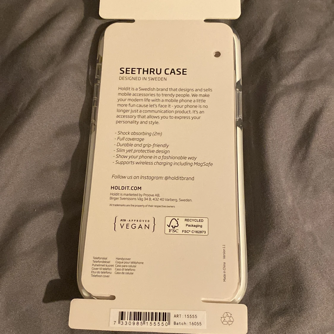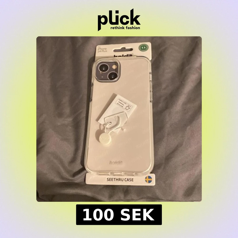 Transparent och stöttåligt mobilskal för iPhone 14 Plus från Holdit. Slimmad design med full täckning, greppvänligt och stöd för trådlös laddning inklusive MagSafe. Produkten är helt ny, oanvänd, vegancertifierad och levereras i återvunnen förpackning. Säljer då jag köpte fel storlek.