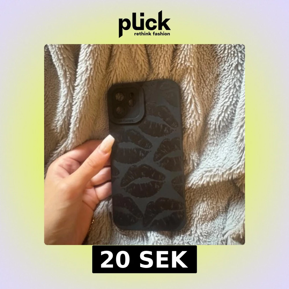 Snygg iPhone 12 i svart med dekorativt läpp-mönstrat skal. Telefonen ser ut att vara i gott skick utan synliga repor eller skador på baksidan. Perfekt för dig som vill ha en stilren och trendig mobil. Skalet skyddar effektivt mot stötar och repor.