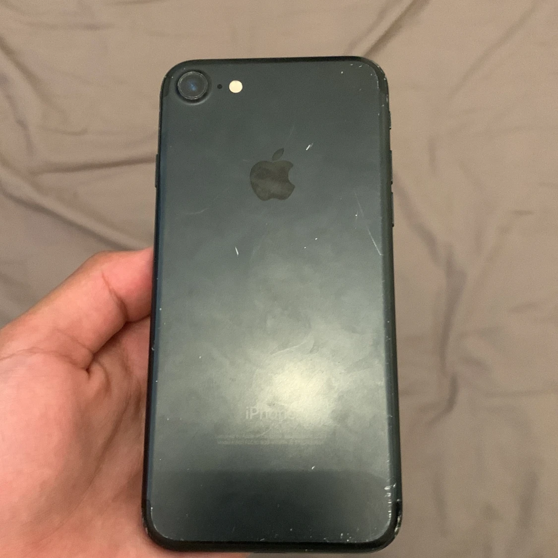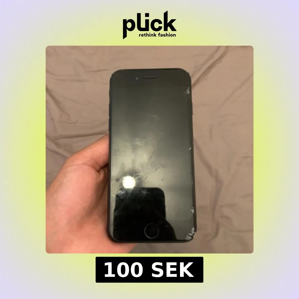 Begagnad iPhone 7 i svart. Skärmen har flera sprickor och repor, särskilt i nedre hörnet. Baksidan och kanterna visar tydligt slitage och repor. Touch ID-knappen syns tydligt. Perfekt som reservtelefon eller för den händige som kan byta skärm.
