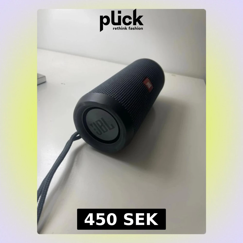 JBL Flip 4 bärbar Bluetooth-högtalare i svart. Ger kraftfullt ljud och har en robust, vattentålig design. Högtalaren ser ut att vara i gott skick utan synliga skador eller slitage. Perfekt för musik både hemma och utomhus.