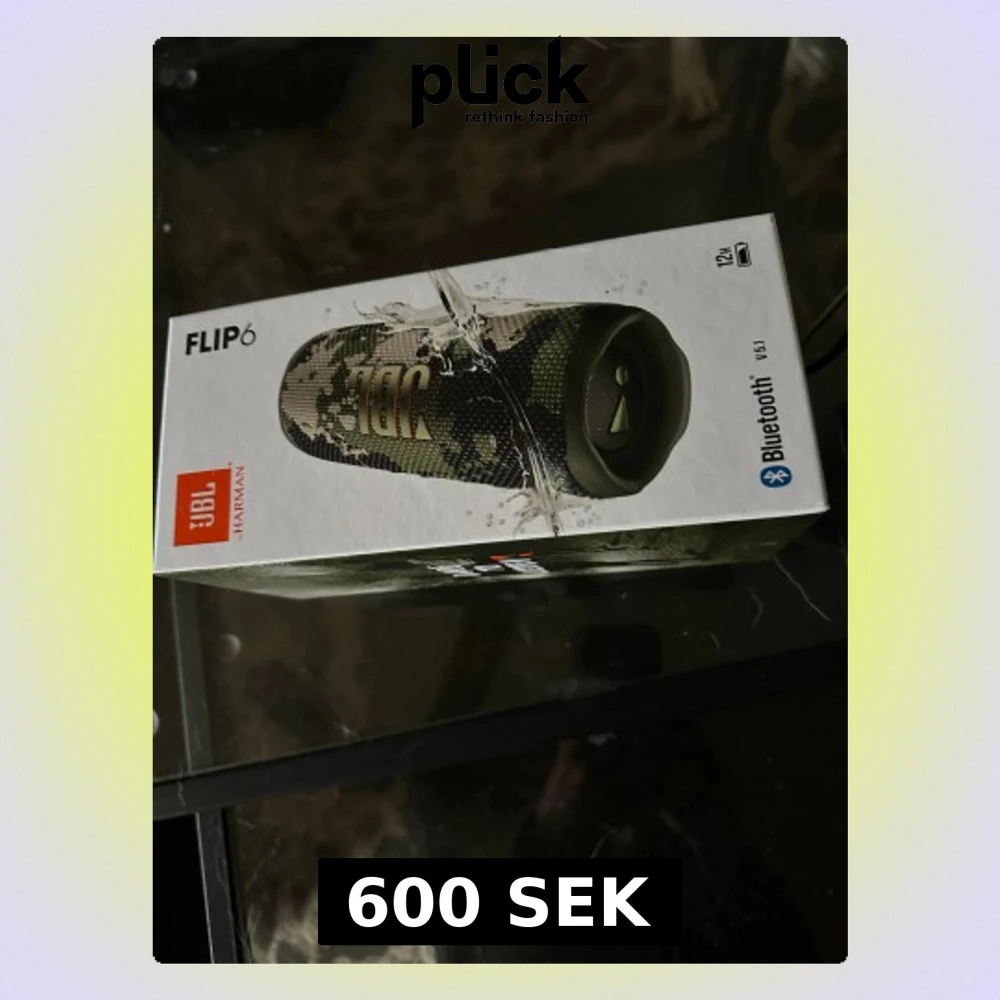 JBL Flip 6 portabel Bluetooth-högtalare i camo-design. Vattentät, upp till 12 timmars batteritid och kraftfullt ljud. Högtalaren och originalkartongen ser ut att vara i mycket gott skick, inga synliga defekter eller slitage. Perfekt för både inomhus och utomhusbruk.HELT NY , endast öppnad för o kort .