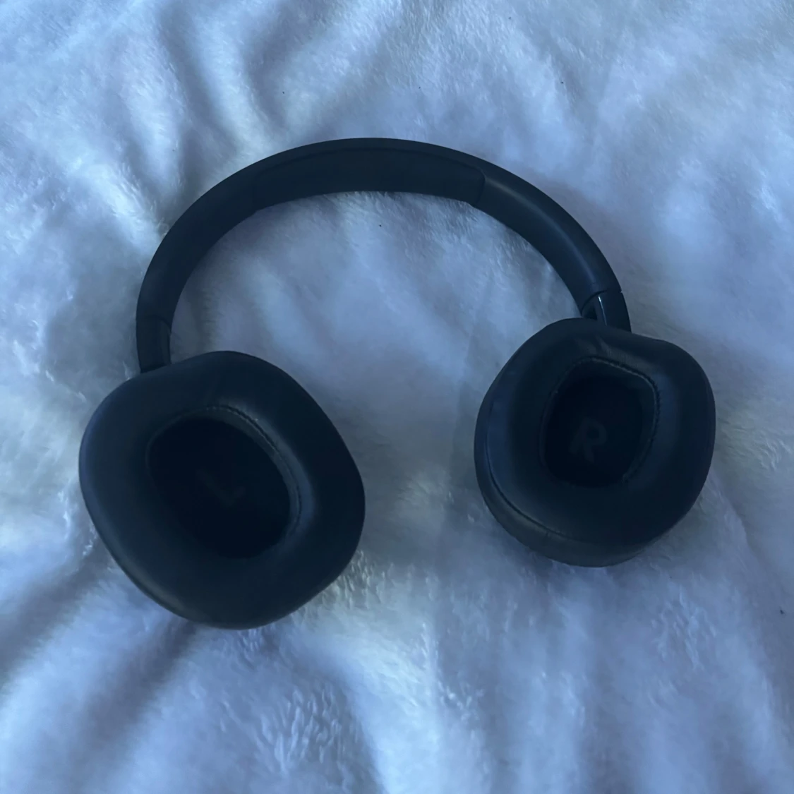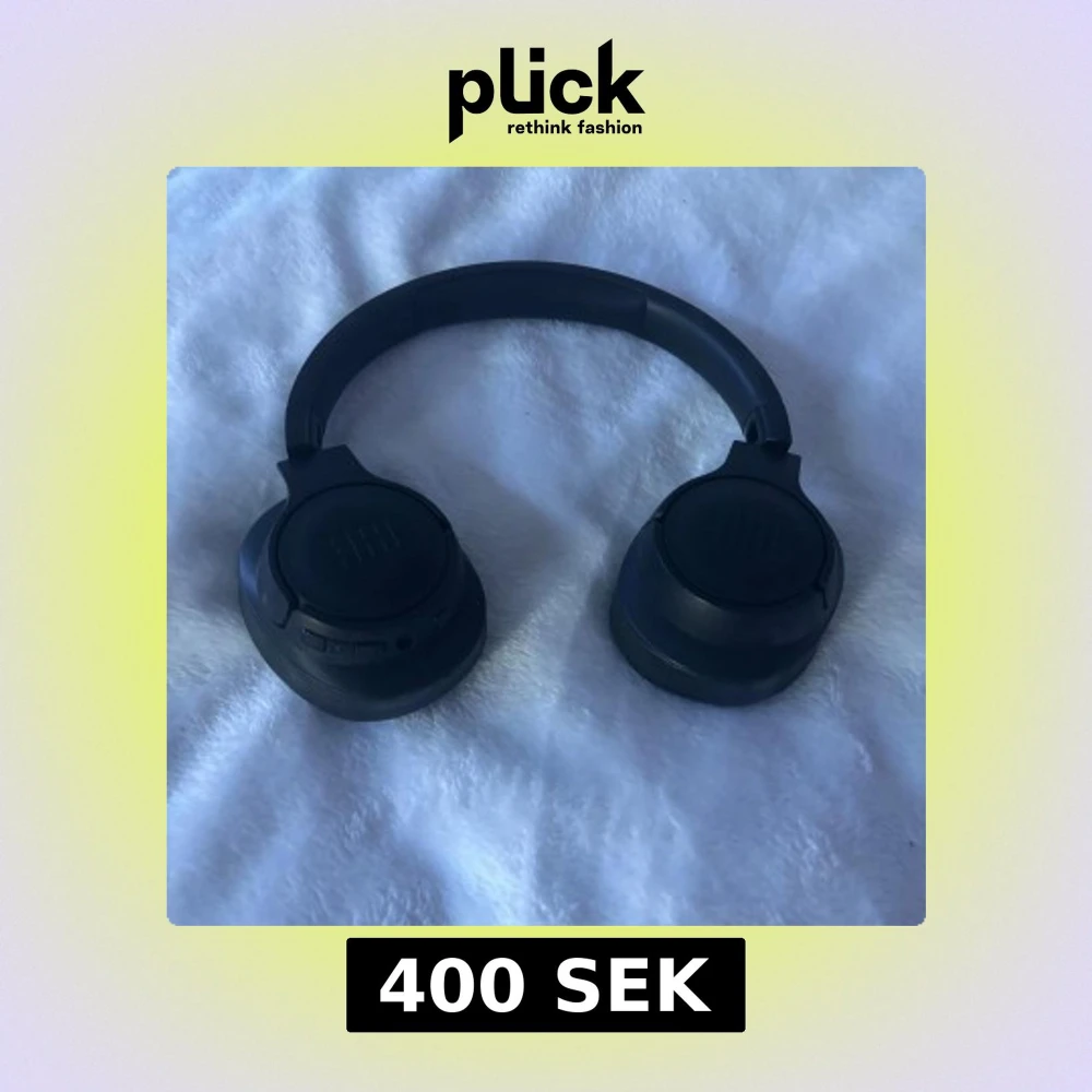 Snygga svarta JBL over-ear hörlurar med trådlös anslutning. Mjuka öronkuddar och tydliga L/R-markeringar. Inbyggda knappar för enkel kontroll. Hörlurarna ser ut att vara i gott skick utan synligt slitage eller defekter.