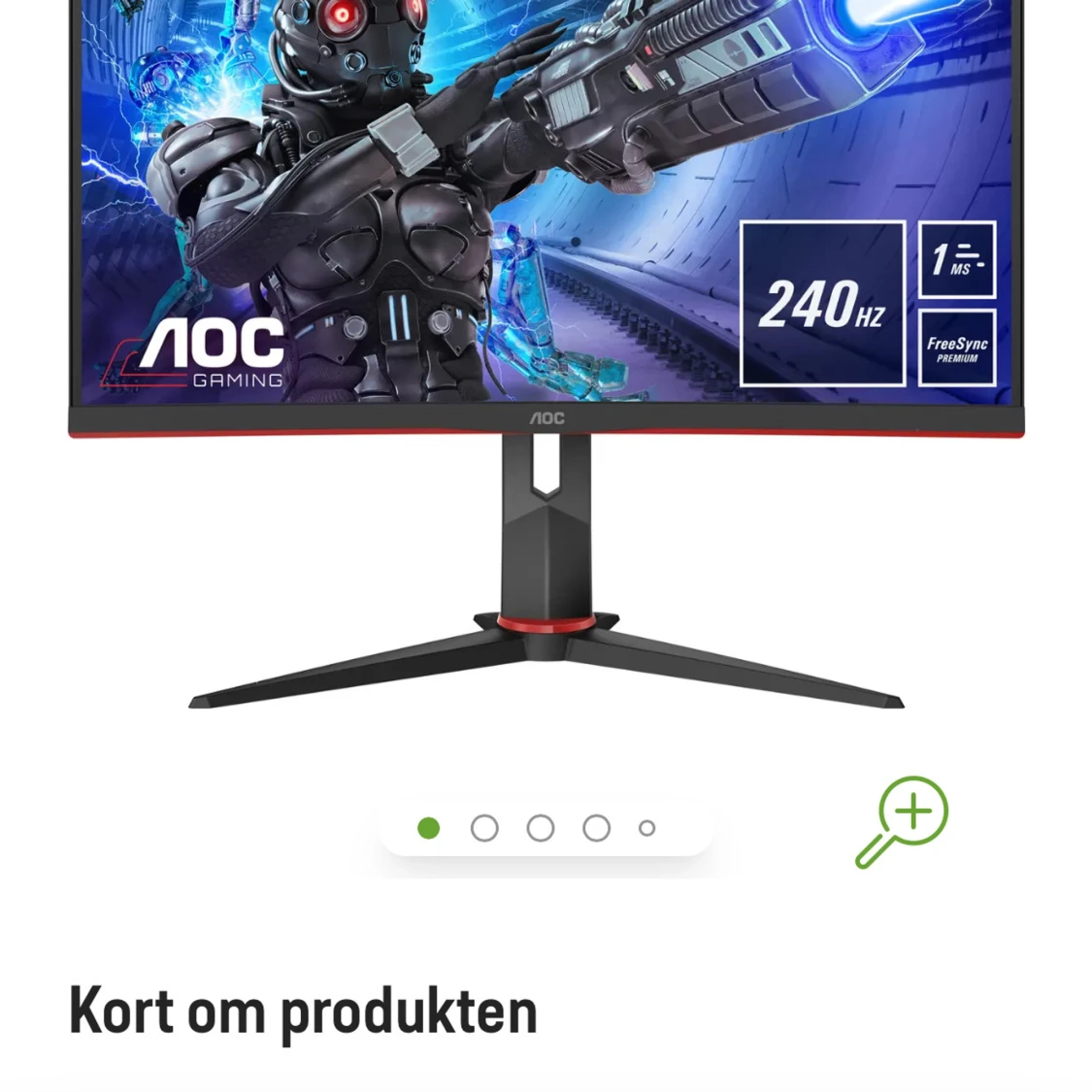 AOC Gaming-skärm med 240Hz uppdateringsfrekvens och 1ms responstid, perfekt för snabba spelupplevelser. FreeSync Premium-stöd. Skärmen är i gott skick utan synliga repor eller skador. Medföljer strömkabel. Modern design med röd detalj på foten.