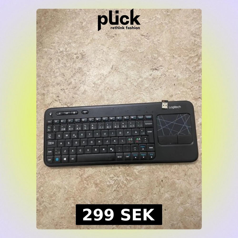 Smidigt trådlöst tangentbord från Logitech med inbyggd touchpad och USB-mottagare. Perfekt för smart-TV eller dator. Tangenter och touchpad i gott skick, mindre ytslitage syns. Fungerar med de flesta operativsystem.