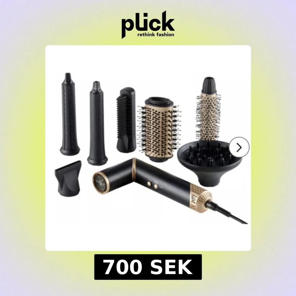 Multistyler hårfön med flera utbytbara tillbehör för styling, inklusive rundborstar, volymmunstycke, kam och locktillbehör. Elegant svart och guld design. är i gott skick utan synligt slitage. Använt 4 gånger endast.