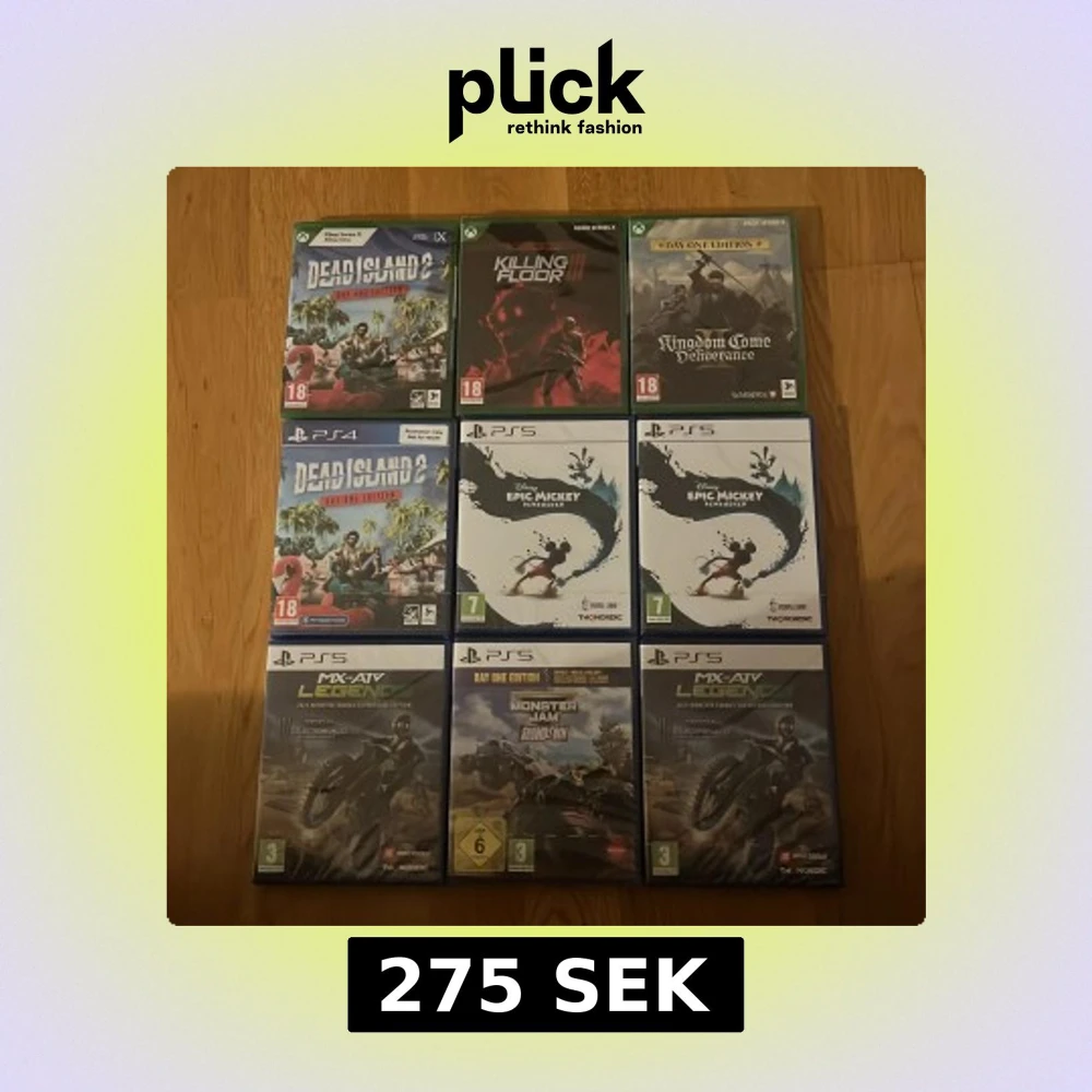 Tv spel Paket med 9 spel för Xbox Series X, PS4 och PS5. Inkluderar Dead Island 2, Killing Floor 3, Kingdom Come Deliverance, Epic Mickey Rebrushed, MX vs ATV Legends och Monster Jam Showdown. Skivorna och fodralen är helt nya och inplastade. 250kr per spel. 2000 för alla