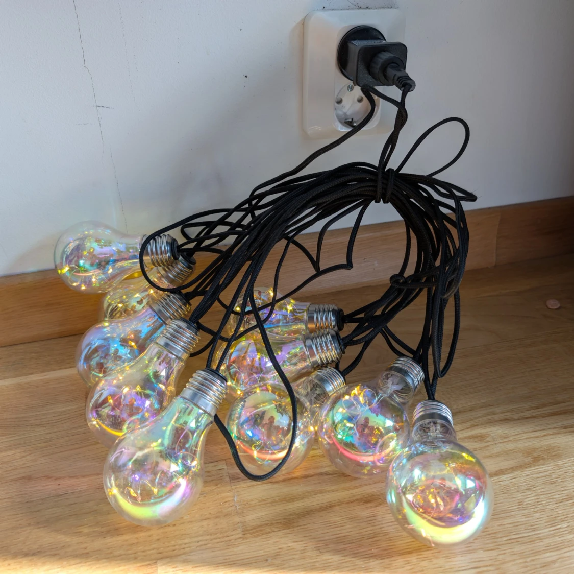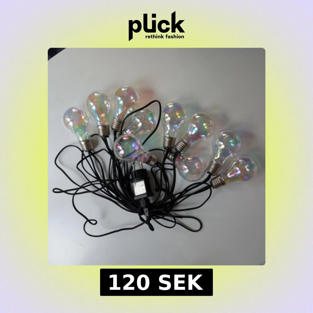 Färgglad dekorationsslinga med 10 LED-glödlampor, ansluts till vägguttag. Ger ett vackert sken med regnbågseffekt, perfekt för fest eller mysbelysning. Svart kabel, EU-kontakt. Fint skick, inga synliga defekter eller slitage.