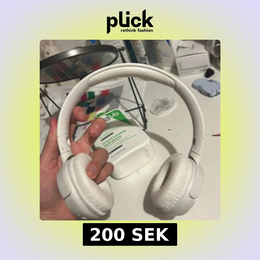 Vita JBL Tune 500BT trådlösa over-ear hörlurar. Lättviktiga och hopfällbara med bekväma öronkuddar. Synligt bruksslitage och mindre repor, men i gott skick och fullt fungerande. Perfekt för musik och samtal med Bluetooth-anslutning.
