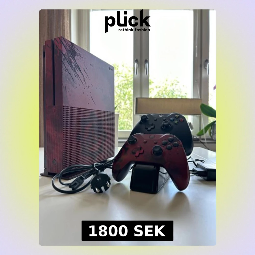 Snygg Xbox One S Gears of War 4 Limited Edition i rött med specialdesign och två handkontroller (en svart, en Gears of War). Konsolen och kontrollerna är mycket gott skick, enda deffekterna är lite slitage på joysticksen. Laddstation och strömkabel ingår.