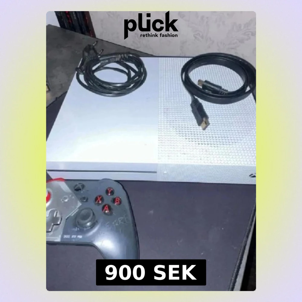 Xbox One S i vitt med tillhörande strömkabel, HDMI-kabel och en specialdesignad handkontroll (RIG XT7 PRO). Konsolen och kontrollen visar visst slitage och repor, men allt ser komplett ut för spelstart.