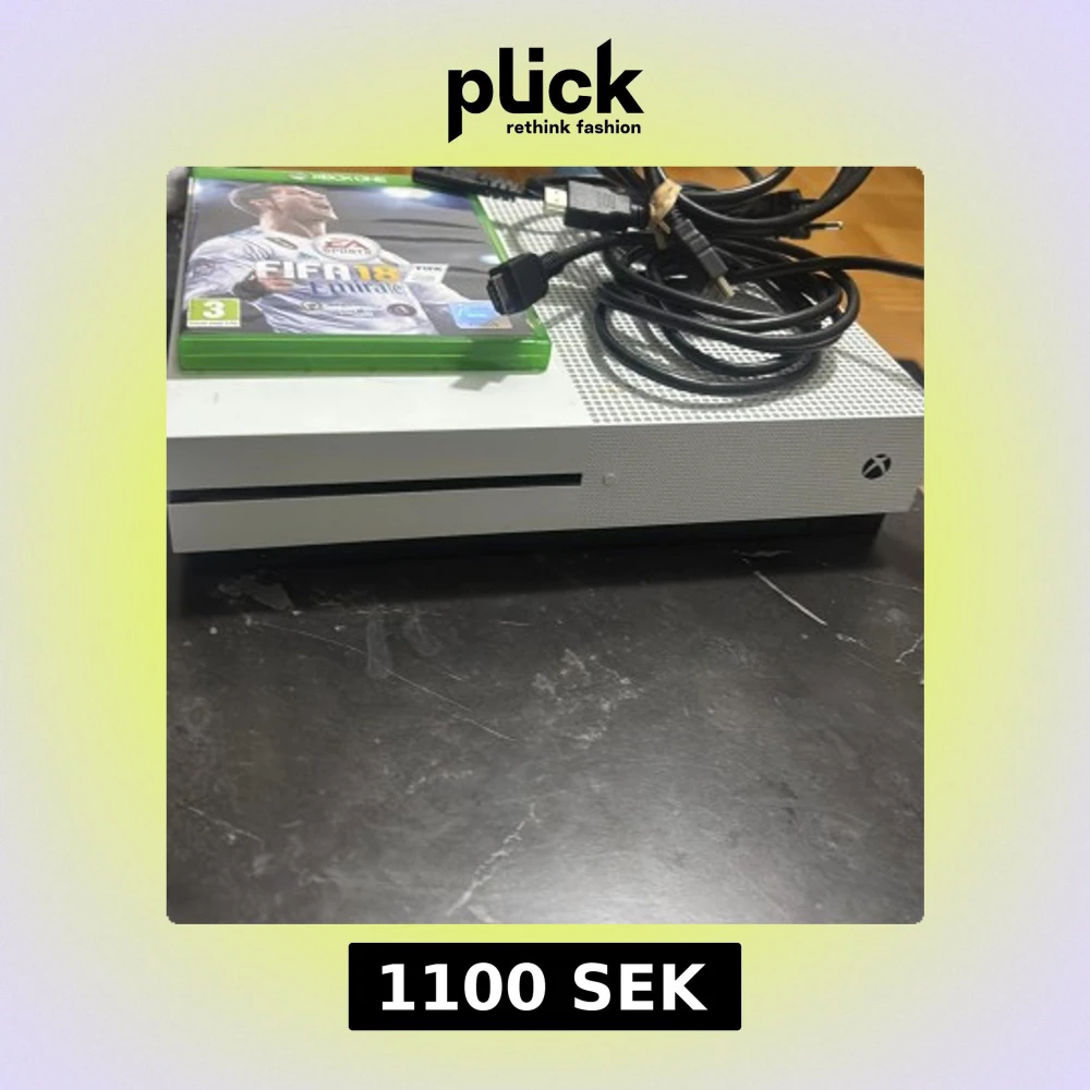Xbox One S i fint skick med två originalkontroller (vit och svart), kablar samt spelet FIFA 18. Konsolen har inga synliga skador. Allt finns det är bara att koppla den och spela .