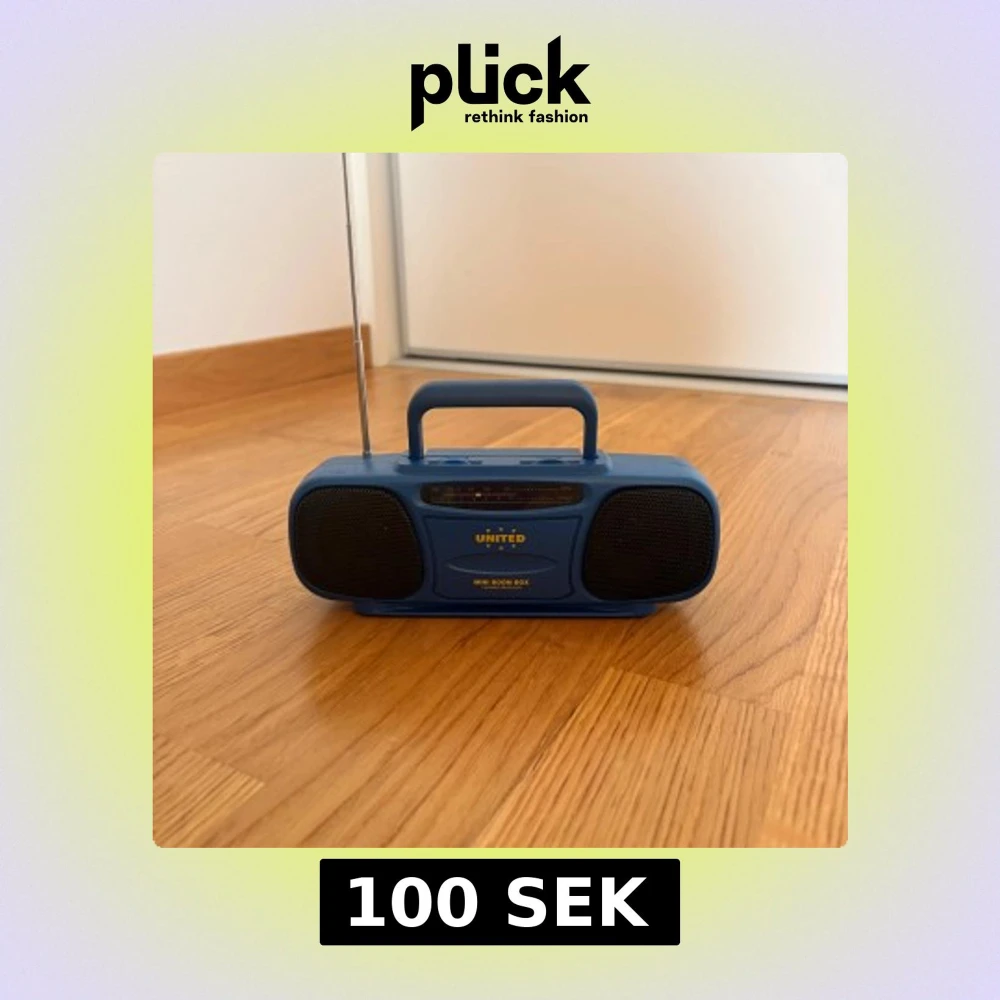 Snygg och portabel blå FM-radio från United, modell Mini Boom Box. Utrustad med två högtalare, teleskopantenn och praktiskt bärhandtag. Volym- och tuningreglage på ovansidan. Fint skick utan synligt slitage, perfekt för picknick eller resor.