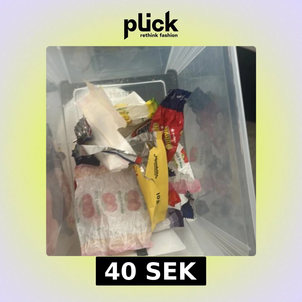 Bilderna visar en plastlåda med tomma godisförpackningar och papper, bland annat från Snickers, Dumle och andra godissorter. Ingen elektronikprodukt syns på bilderna.