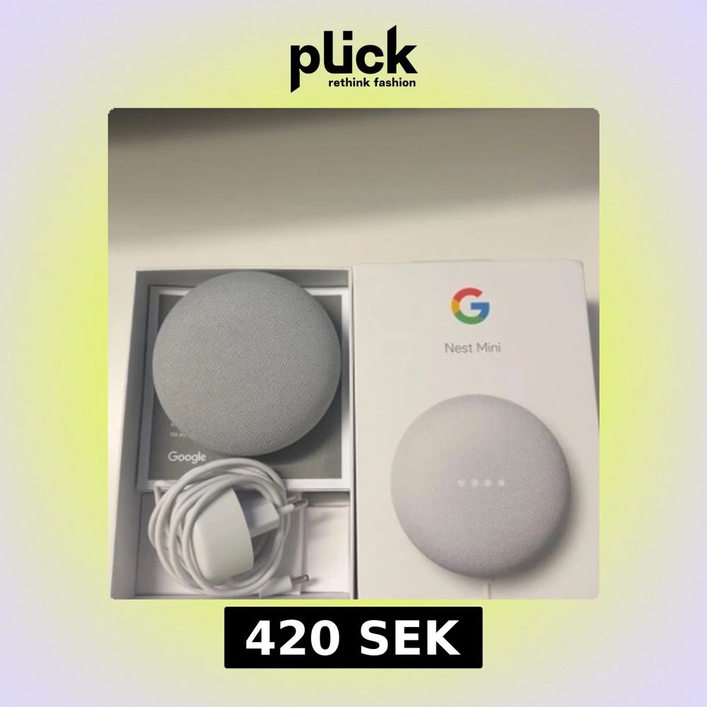 Google Nest Mini smart högtalare i originalförpackning med laddare. Produkten ser ut att vara i nyskick utan synliga repor eller slitage. Perfekt för röststyrning, musikstreaming och smarta hem-funktioner.