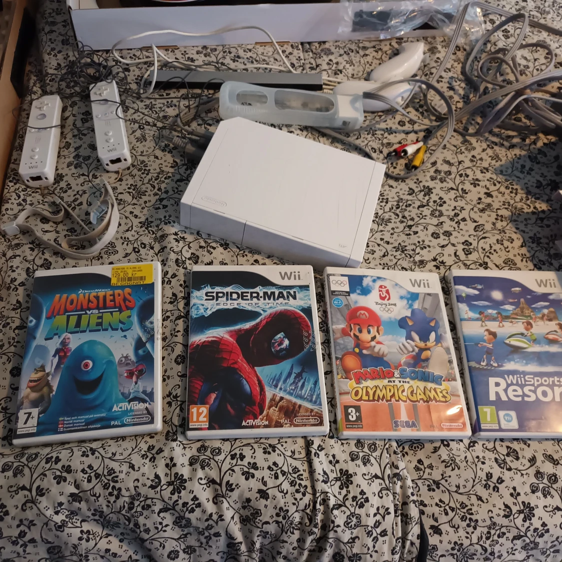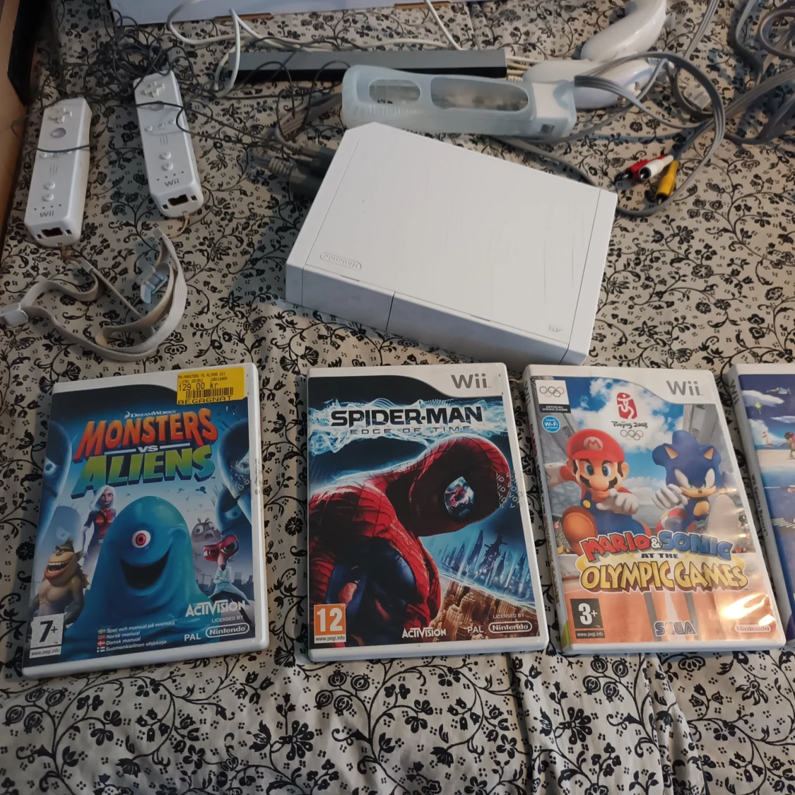 Nintendo Wii i vitt med originalkartong, två Wii-fjärrkontroller, nunchuk, sensorbar, kablar och fyra populära spel: Monsters vs Aliens, Spider-Man, Mario & Sonic at the Olympic Games och Wii Sports Resort.