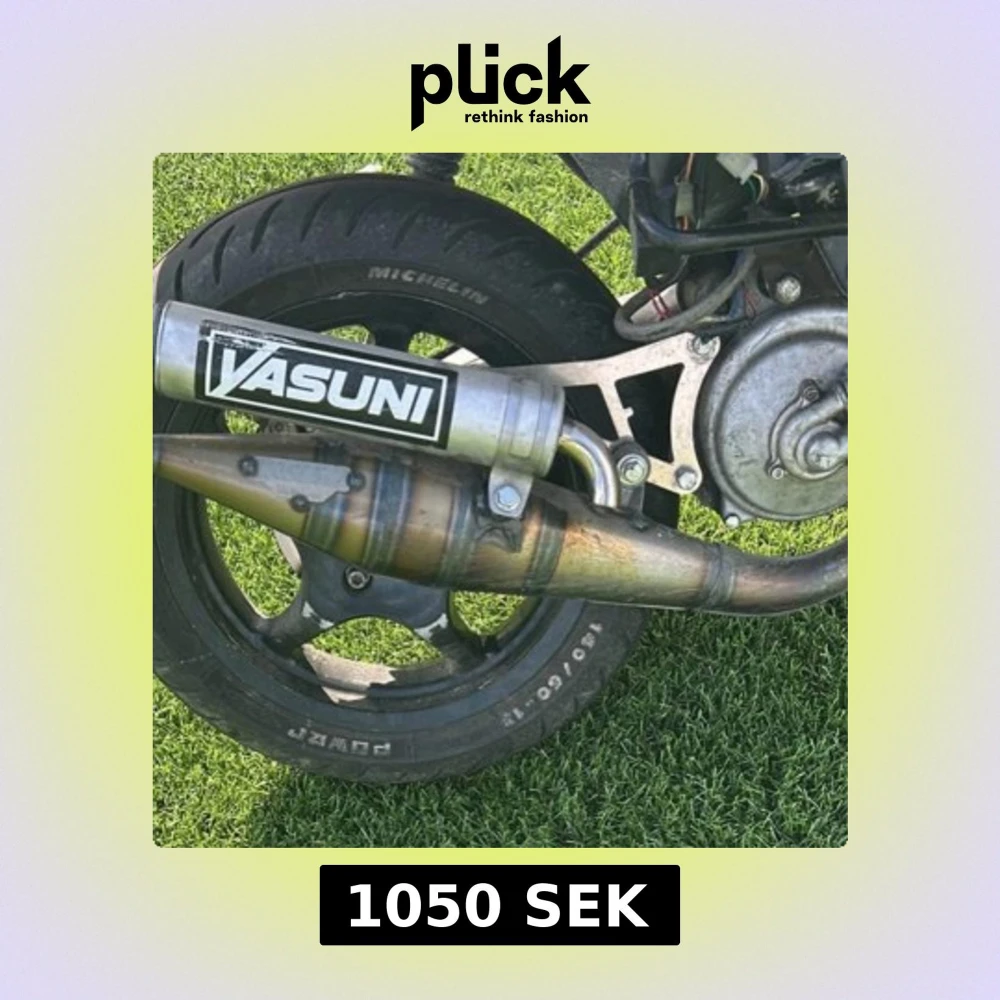 Vasuni avgassystem för moped eller scooter, i gott skick med synliga svetsfogar och lättare bruksspår. Passar utmärkt för dig som vill uppgradera prestandan och ljudet på ditt fordon. Monteringsdetaljer och ljuddämpare ingår.