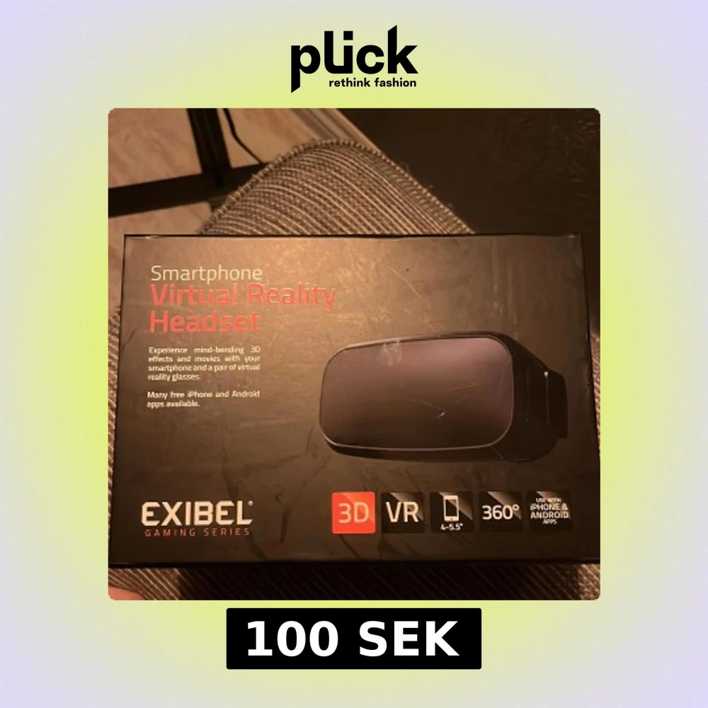 Virtuellt reality-headset från Exibel Gaming Series för smartphones (4–5,5 tum). Kompatibel med både iPhone och Android. Skapar 3D- och 360°-upplevelser med justerbara remmar och bekväm vaddering. Den är i mycket gott skick, inga synliga defekter.