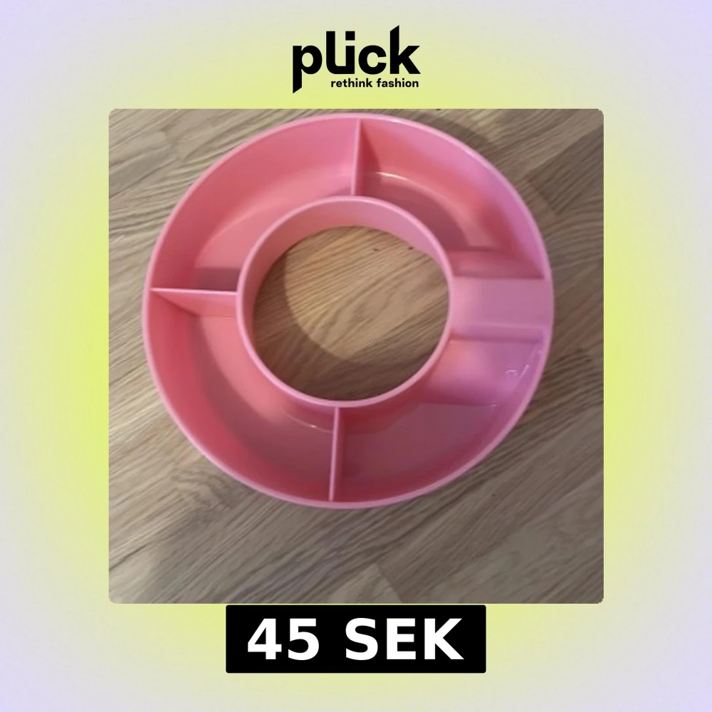 Bilderna visar en rosa plastbricka med flera fack, troligen avsedd för snacks eller småplock. Produkten har en rund form med en cirkulär öppning i mitten och ser ut att vara i gott skick utan synliga skador eller slitage. Perfekt för servering vid fest eller picknick. Till din standly som du sätter på är från amazon