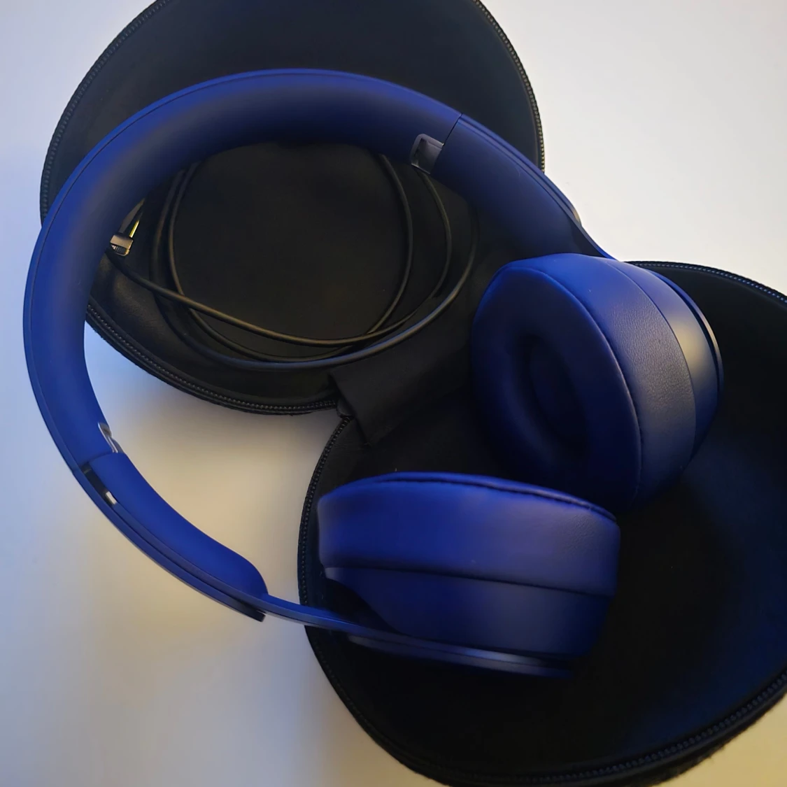 Snygga blå Beats Studio3 Wireless over-ear hörlurar i originalfodral. Hörlurarna är i mycket gott skick, med mjuka kuddar och inga synliga repor eller skador. Medföljer laddningskabel. Perfekt för musik, resor och arbete tack vare aktiv brusreducering och lång batteritid. I nyskick och endast provade.