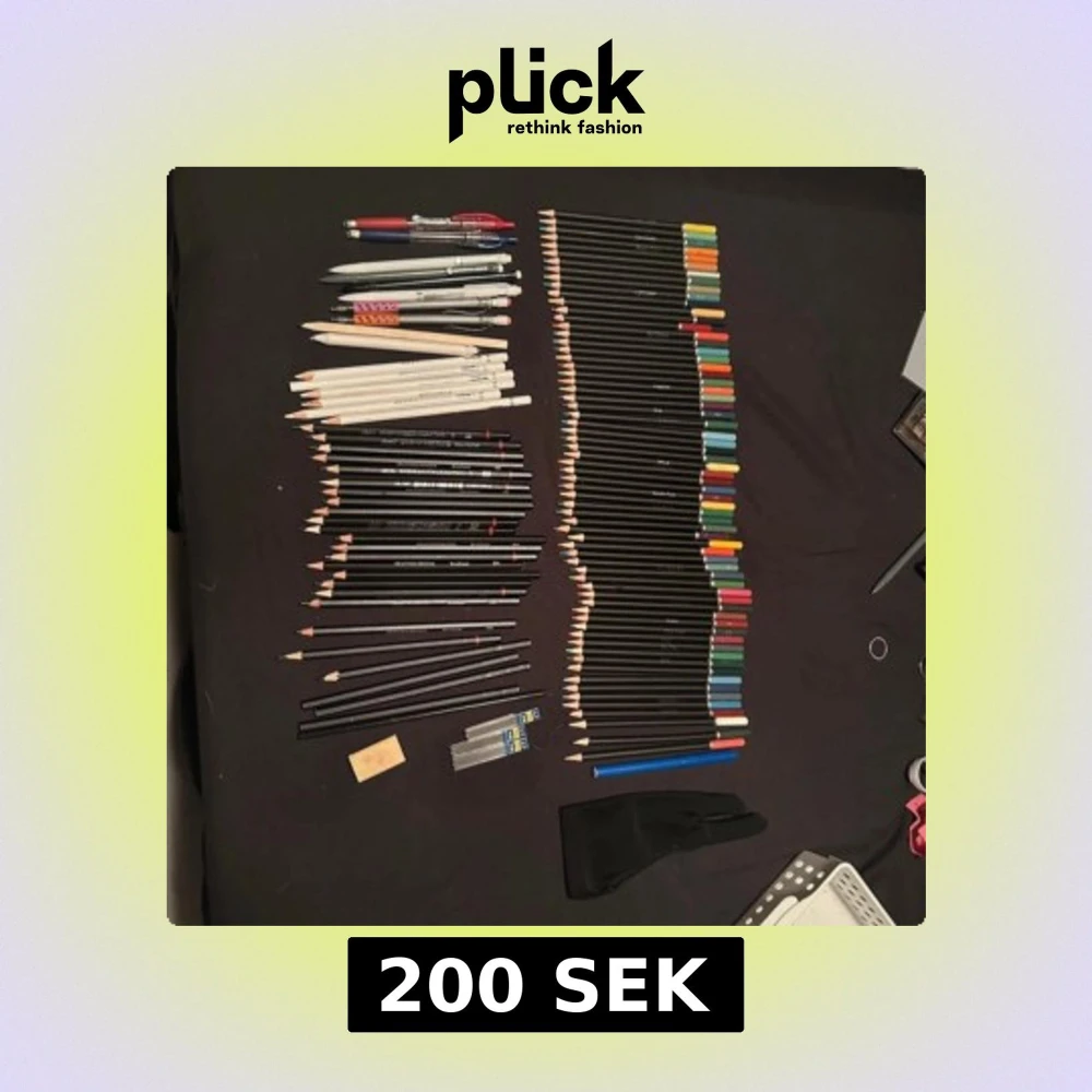 Bilden visar ett stort set med pennor, blyertspennor, färgpennor, stiftpennor, bläckpennor och tillbehör som suddgummi och stift. Perfekt för teckning, skiss och skrivande. Pennorna ser använda men välskötta ut. Inga synliga defekter. Ej elektronik.