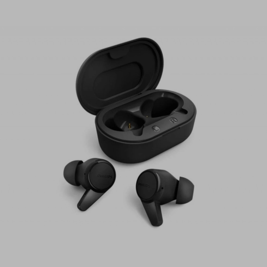Snygga svarta Philips true wireless hörlurar med laddningsetui. Kompakt design, perfekt för musik och samtal på språng. Hörlurarna och etuiet ser ut att vara i mycket gott skick utan synligt slitage eller repor.